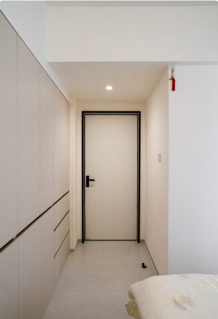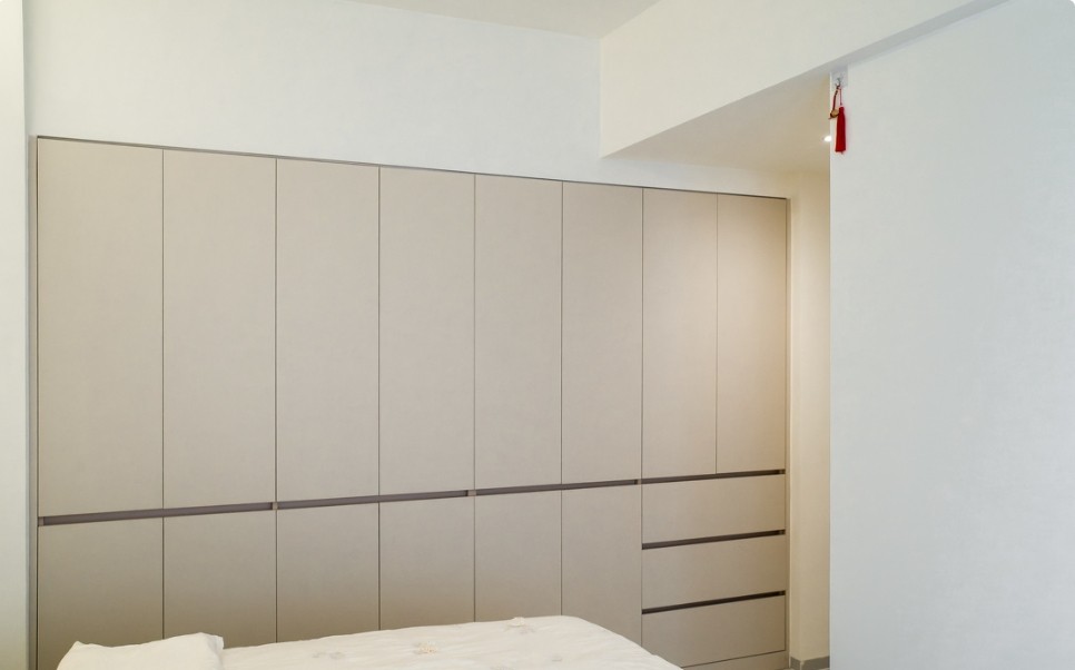 卧室借取了儿童房和走廊的面积,定制一整墙的衣柜,入墙的设计,不但把收纳空间直线拉满,还灭掉了许多卫生死角,更整洁显大。