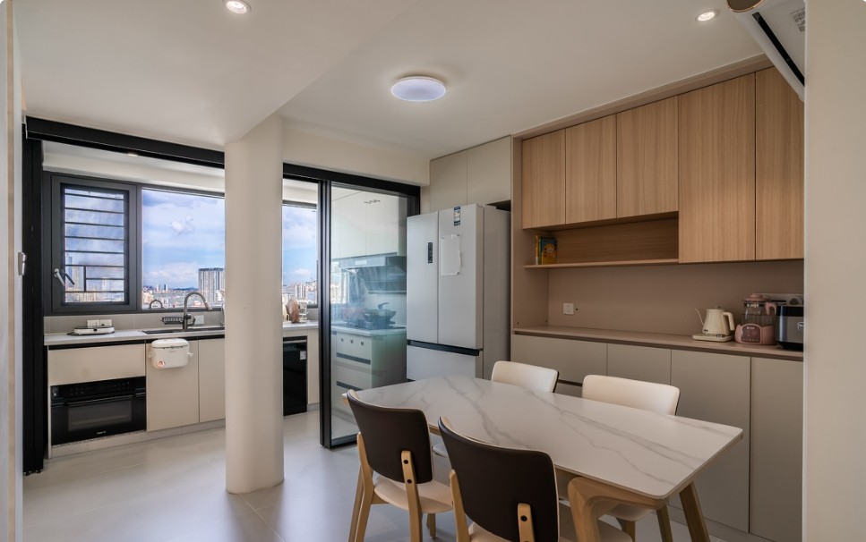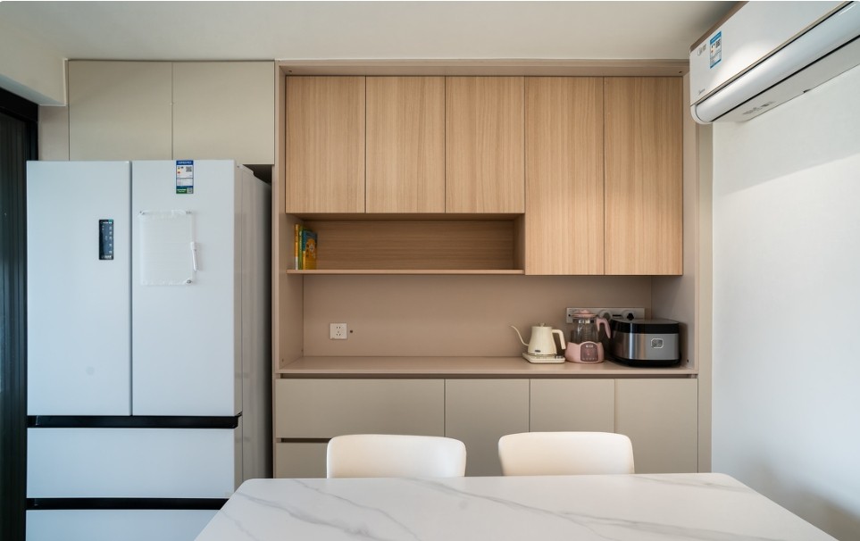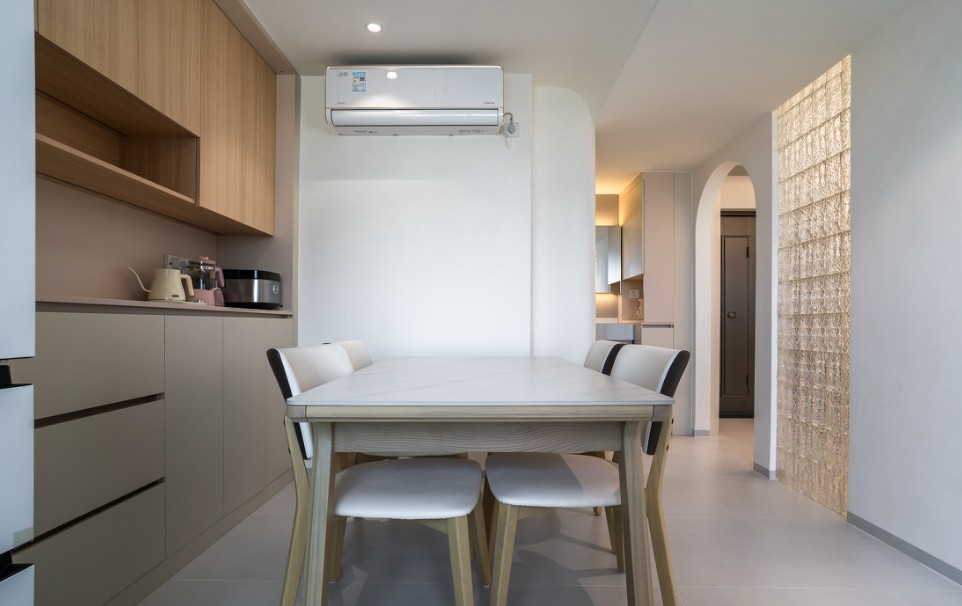 餐厅在奶油色调的基础上,增添了许多原木纹理,给素雅的空间增添了一丝烟火气,让用餐氛围更加温馨。