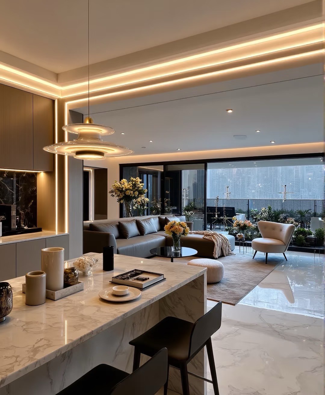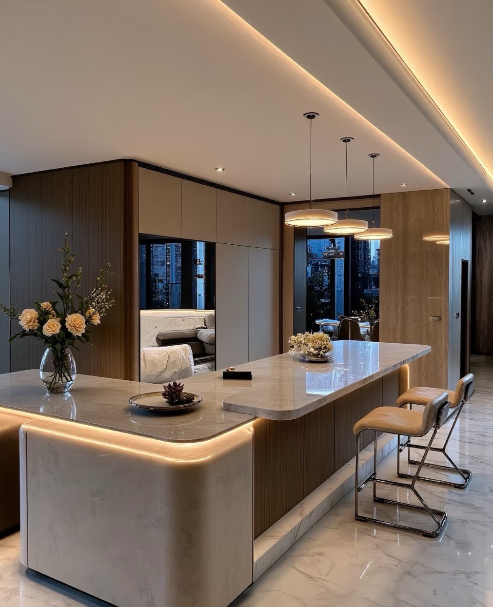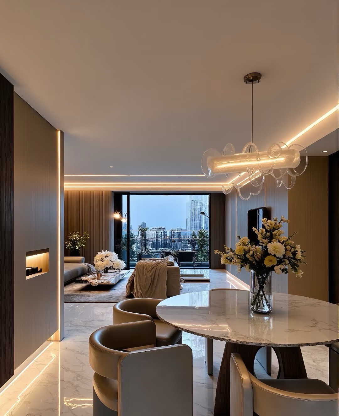 空间以浅棕、米白为主色调,搭配大理石材质,通过暗藏灯带勾勒空间层次,营造出通透明亮、精致大气的氛围。开放式餐厨增强互动性,客厅电视墙与沙发区细节考究,从硬装到软装,处处体现对品质生活的追求,诠释理想家居模样 。
