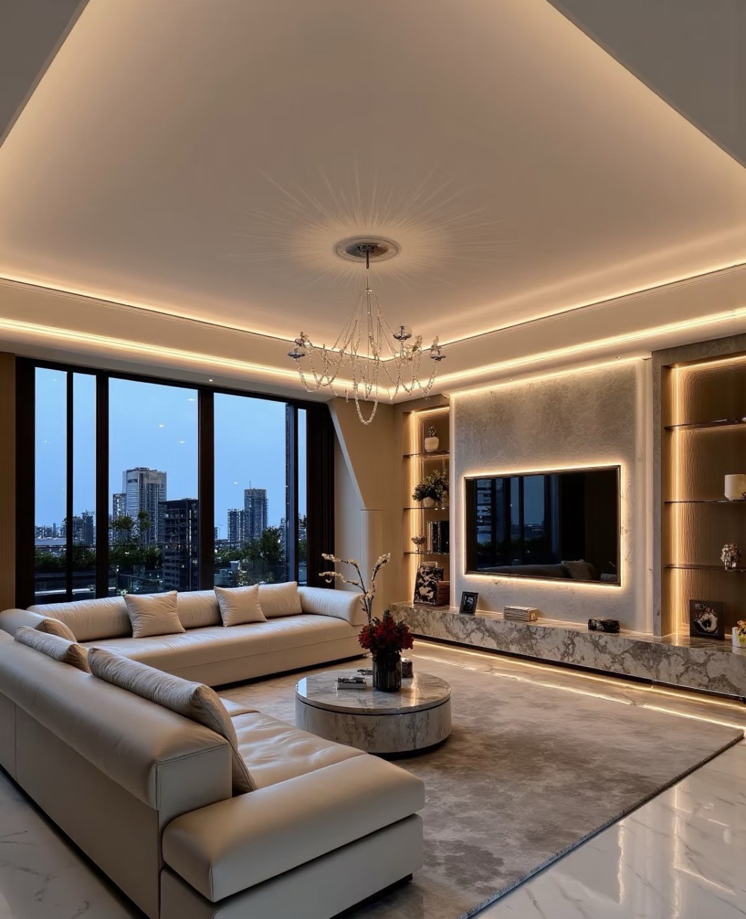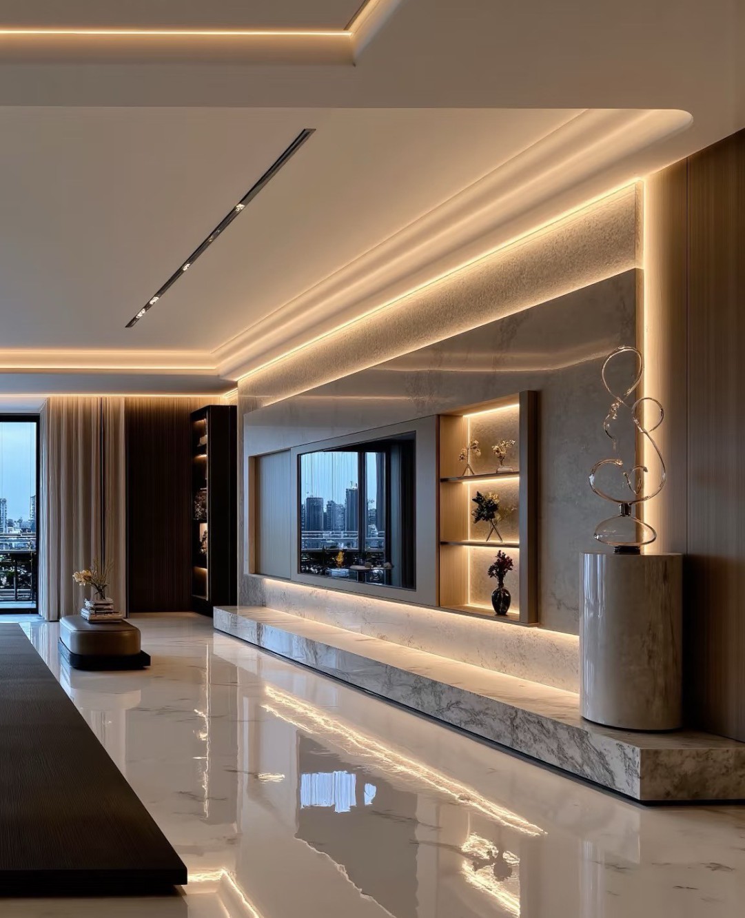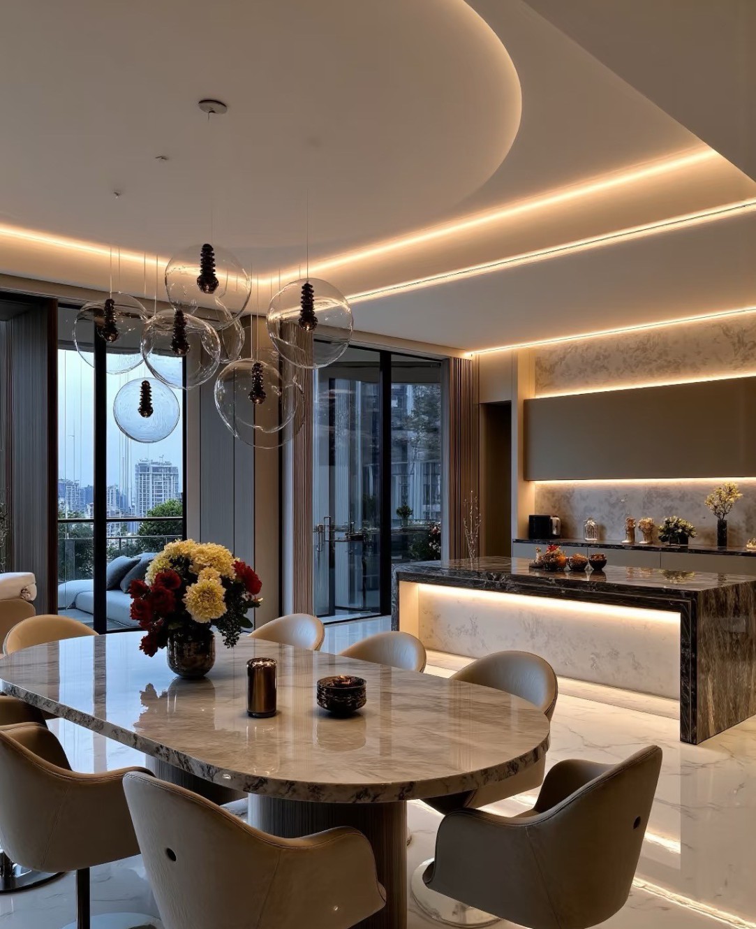 空间以浅棕、米白为主色调,搭配大理石材质,通过暗藏灯带勾勒空间层次,营造出通透明亮、精致大气的氛围。开放式餐厨增强互动性,客厅电视墙与沙发区细节考究,从硬装到软装,处处体现对品质生活的追求,诠释理想家居模样 。