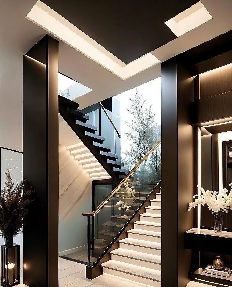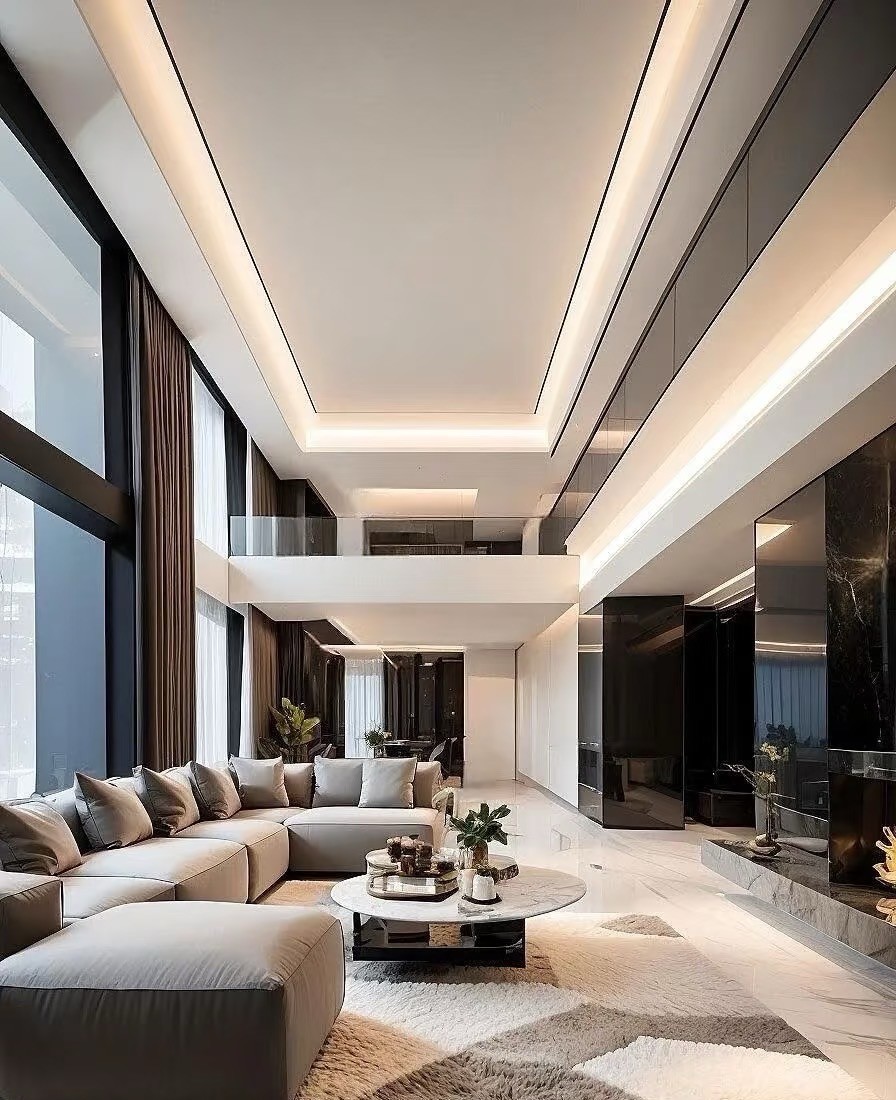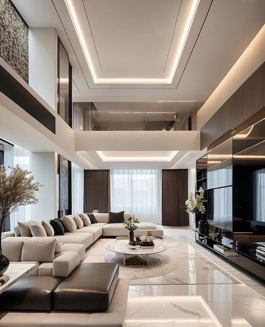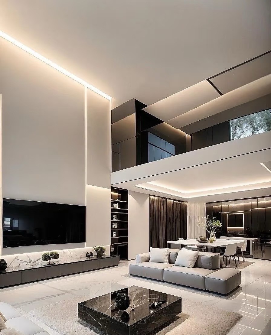 这是一套现代简约风复式家装案例。以黑白灰为主色调,搭配大理石、皮质等材质,营造出高级质感。客厅挑高设计,通透明亮,无主灯+线性灯勾勒空间层次;开放式餐厨简洁大气,卧室舒适静谧,楼梯精致有设计感。整体风格简约时尚,注重空间利用与光线营造,诠释都市品质生活。