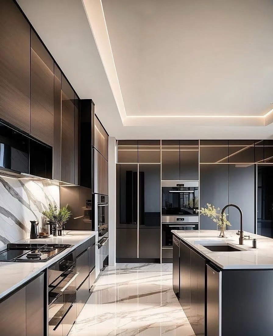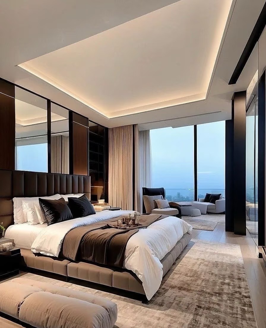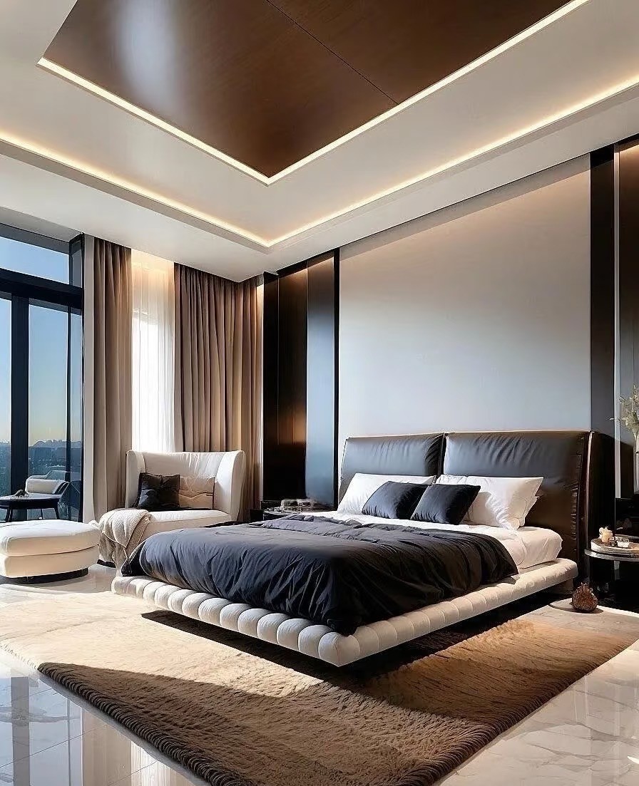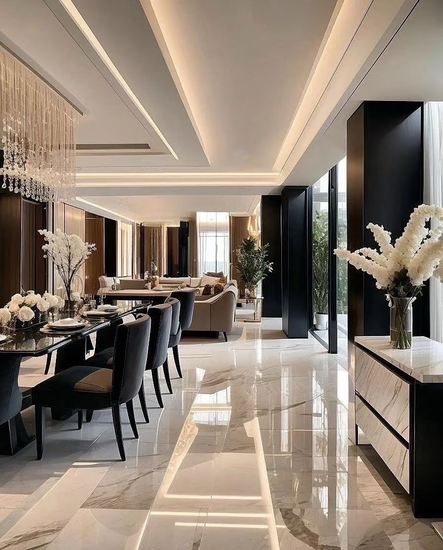 这是一套现代简约风复式家装案例。以黑白灰为主色调,搭配大理石、皮质等材质,营造出高级质感。客厅挑高设计,通透明亮,无主灯+线性灯勾勒空间层次;开放式餐厨简洁大气,卧室舒适静谧,楼梯精致有设计感。整体风格简约时尚,注重空间利用与光线营造,诠释都市品质生活。