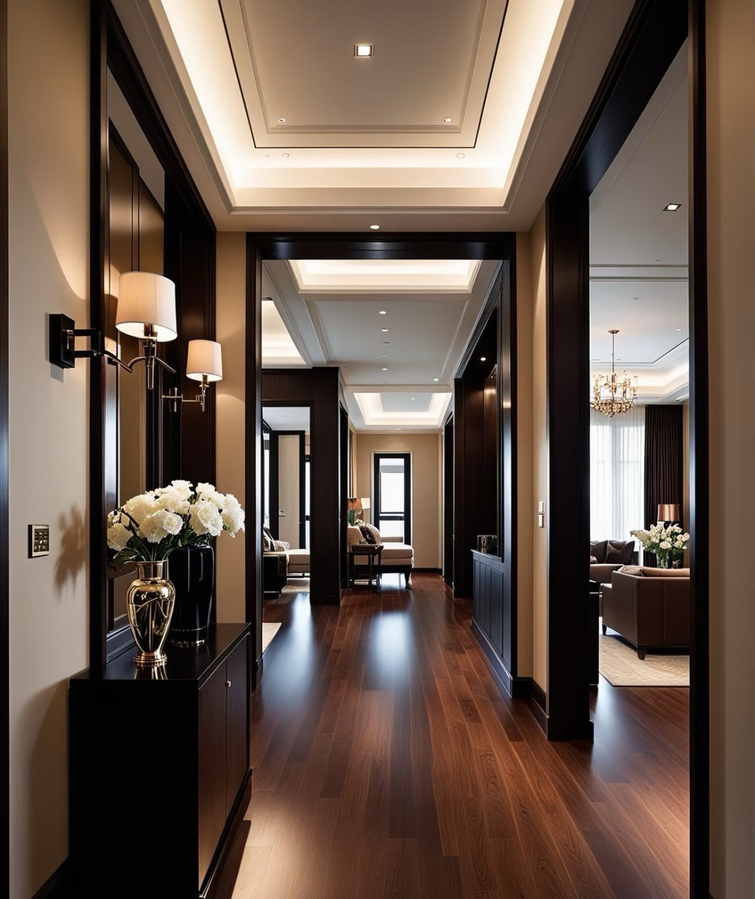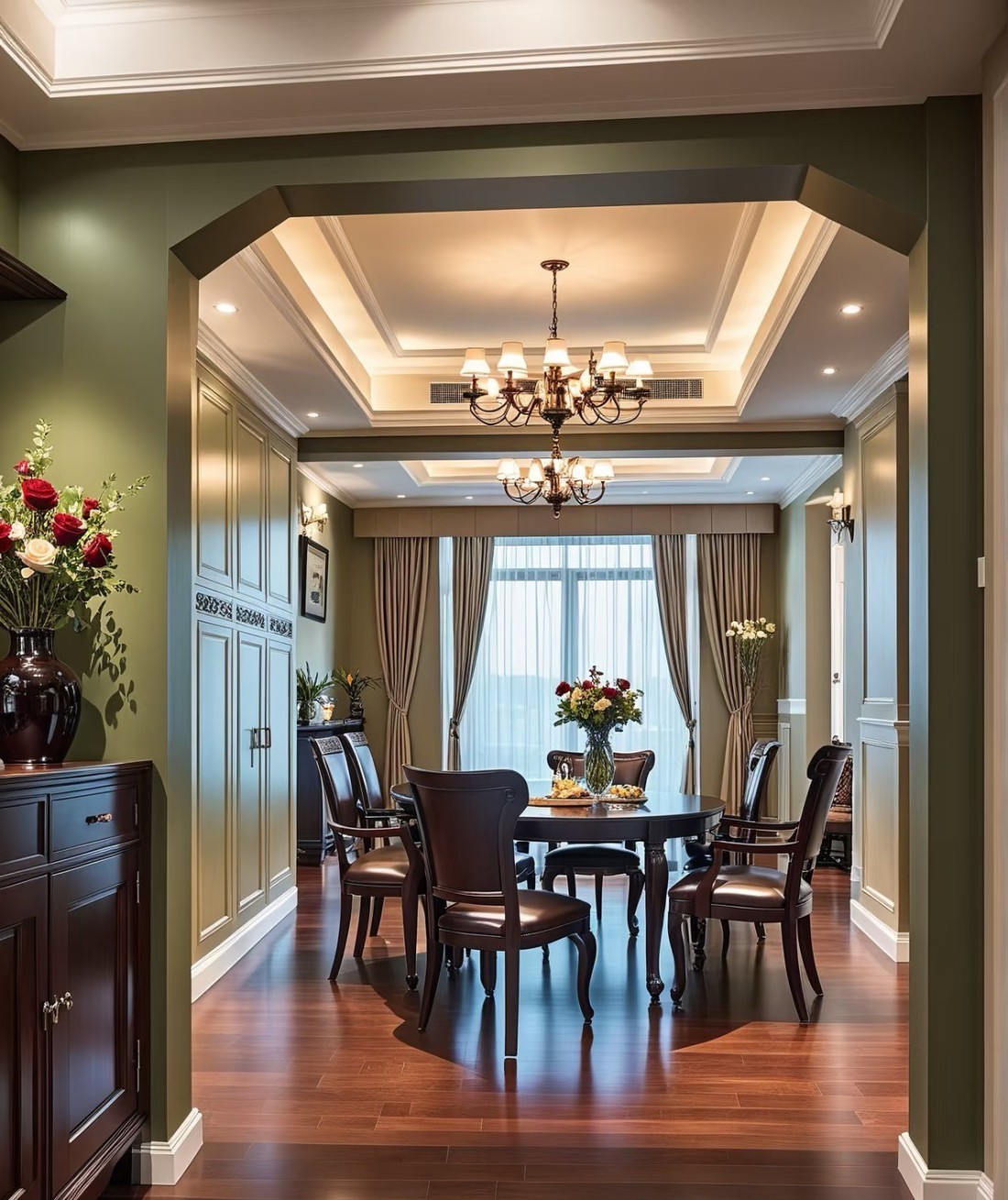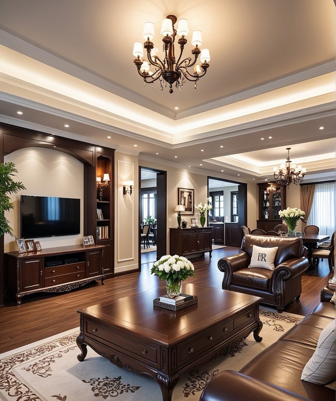 这套家装案例融合美式与现代风格,以温润木地板打底,搭配精致吊灯、复古家具,营造典雅氛围。低饱和莫兰迪色墙面,与深色柜体、皮质家具碰撞,层次丰富。灯光设计巧妙,线性灯带勾勒吊顶,壁灯、台灯添氛围感。餐厨区开放式布局实用且宜交流,卧室重舒适,床品摆件温馨,廊道借装饰画、花艺延展空间,风格统一,细节显品质,打造优雅舒适居所 。