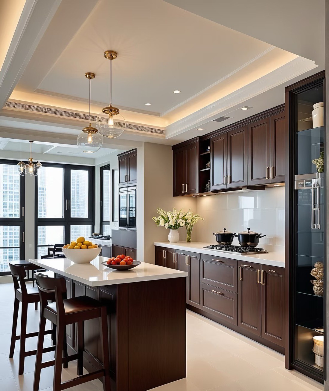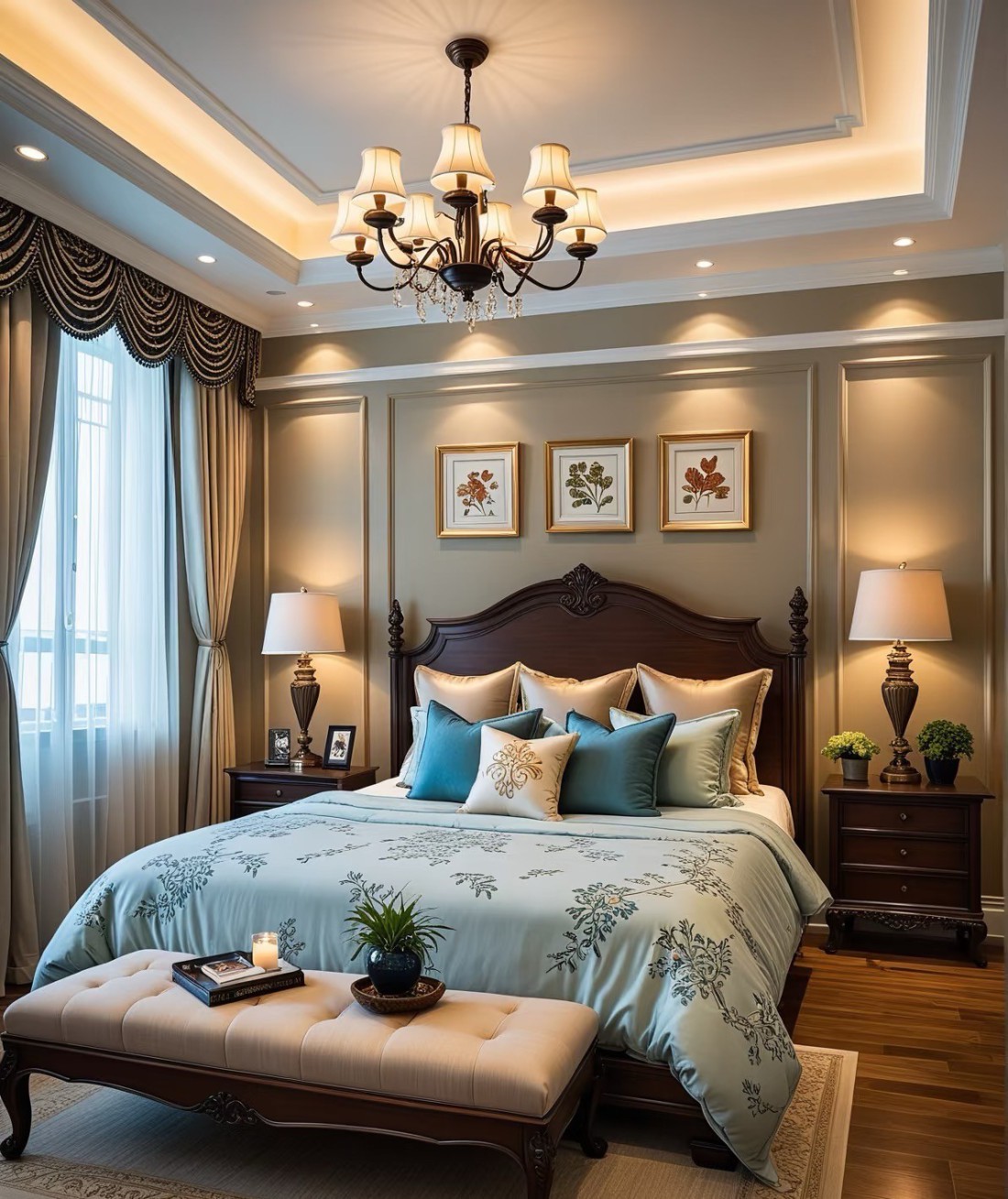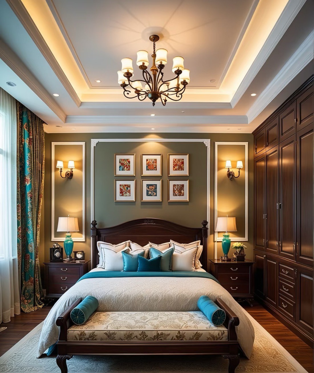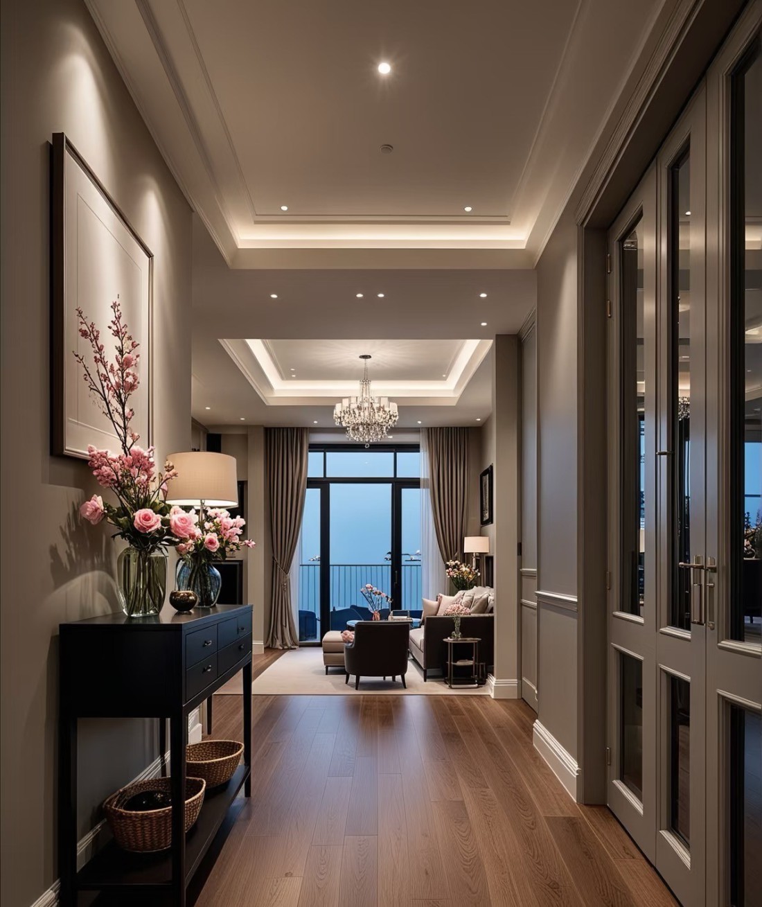 这套家装案例融合美式与现代风格,以温润木地板打底,搭配精致吊灯、复古家具,营造典雅氛围。低饱和莫兰迪色墙面,与深色柜体、皮质家具碰撞,层次丰富。灯光设计巧妙,线性灯带勾勒吊顶,壁灯、台灯添氛围感。餐厨区开放式布局实用且宜交流,卧室重舒适,床品摆件温馨,廊道借装饰画、花艺延展空间,风格统一,细节显品质,打造优雅舒适居所 。
