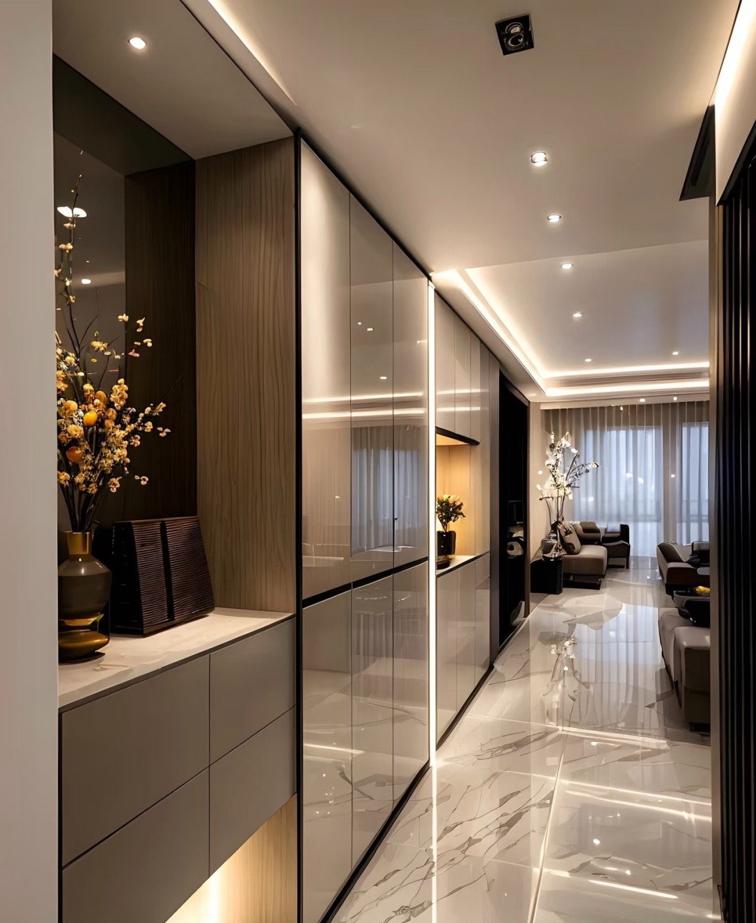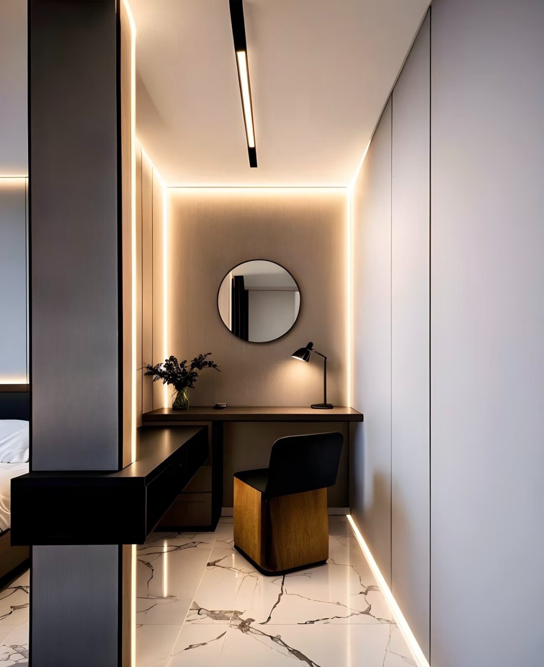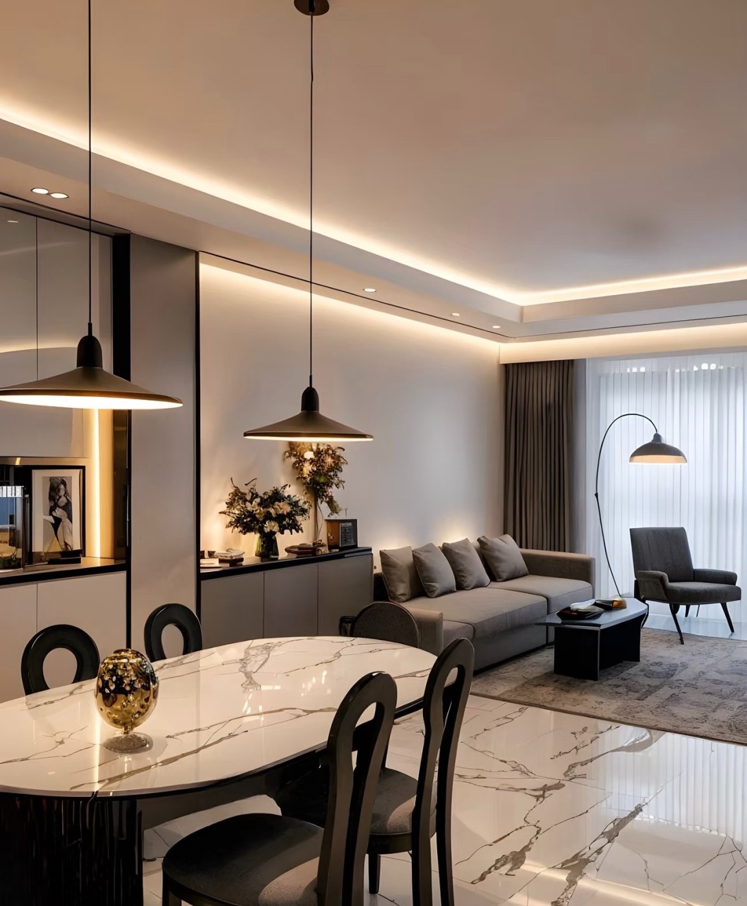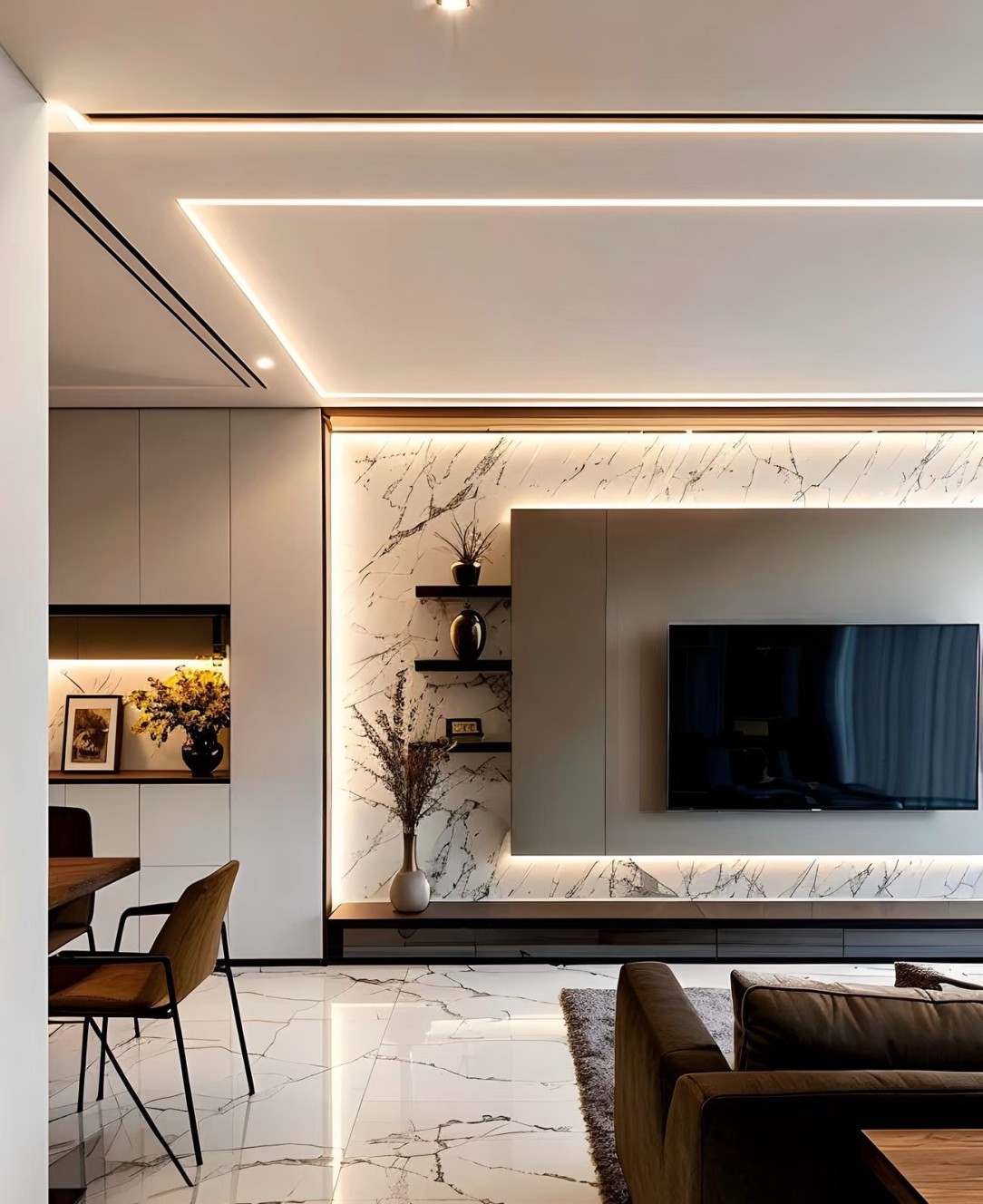 这是一套现代简约风格的室内设计案例,涵盖客厅、餐厅、书房、卫浴、卧室等空间。整体以黑白灰为主色调,搭配大理石纹理地面,简洁大气。大量运用线性灯带,营造温馨且富有层次感的光环境,提升空间精致感。柜体设计简约实用,融入墙体内,实现收纳与美观兼具,软装搭配精致,绿植、摆件点缀增添生机与艺术氛围,打造出时尚、舒适且高级的居住空间。