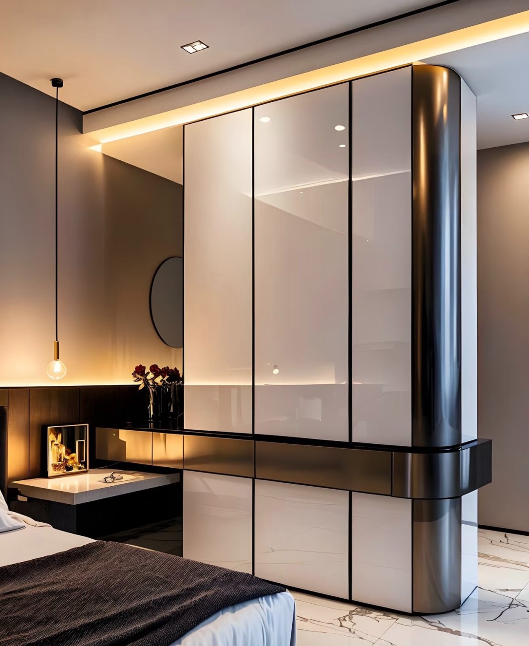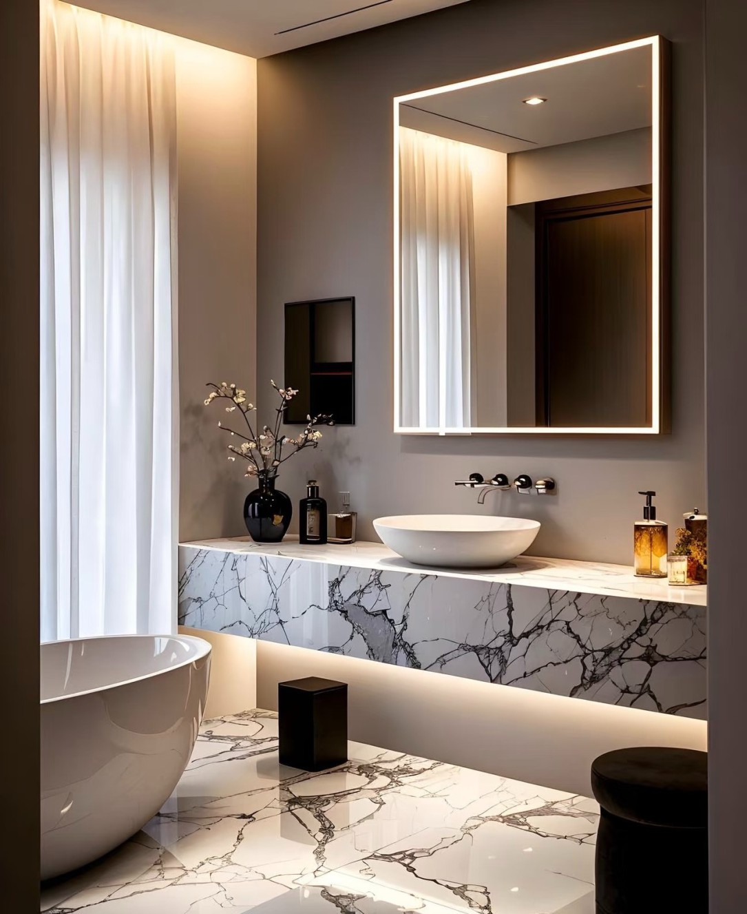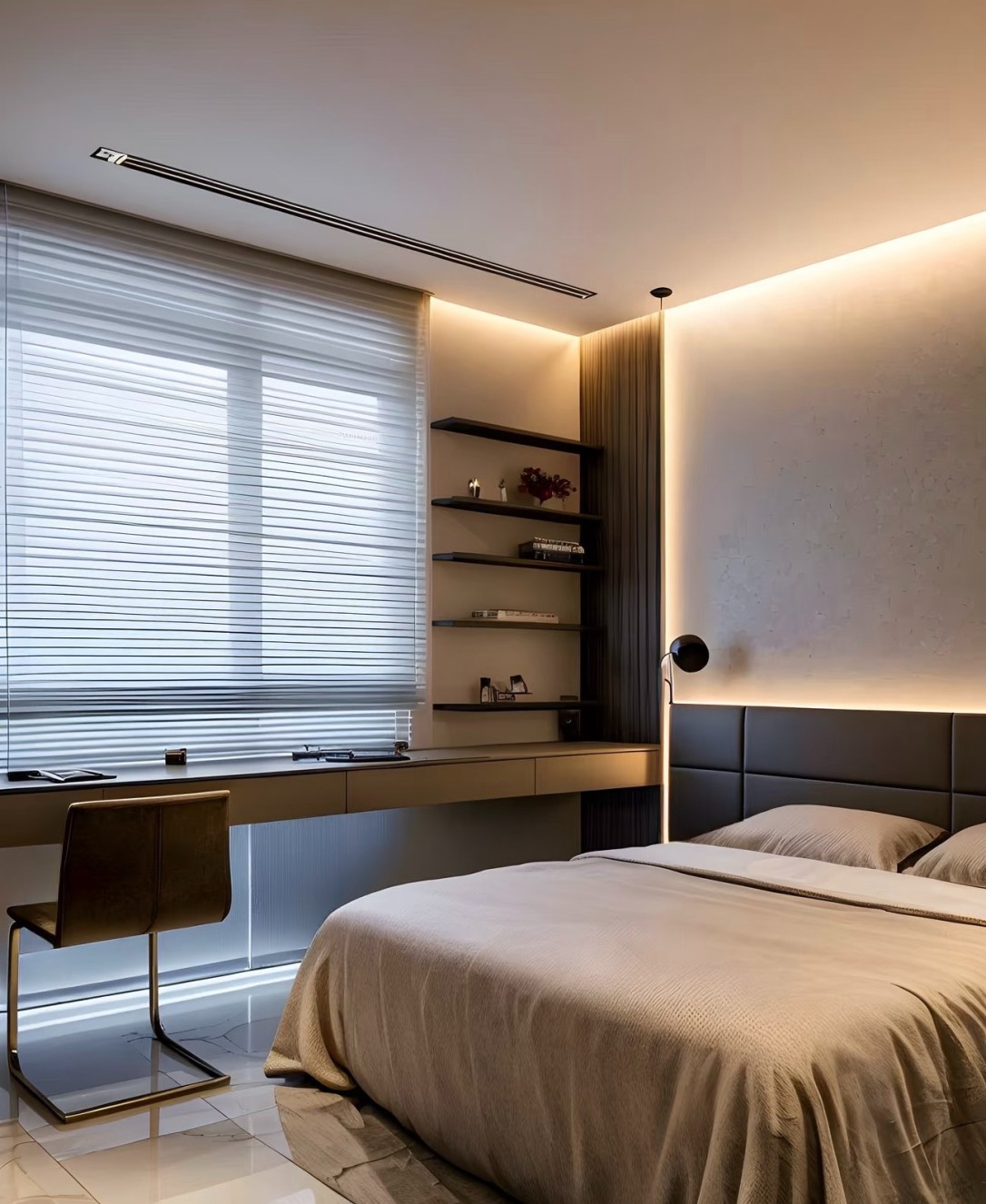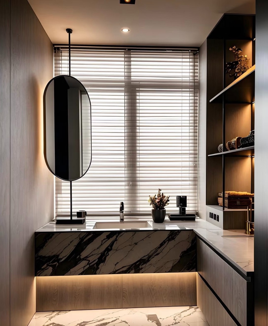 这是一套现代简约风格的室内设计案例,涵盖客厅、餐厅、书房、卫浴、卧室等空间。整体以黑白灰为主色调,搭配大理石纹理地面,简洁大气。大量运用线性灯带,营造温馨且富有层次感的光环境,提升空间精致感。柜体设计简约实用,融入墙体内,实现收纳与美观兼具,软装搭配精致,绿植、摆件点缀增添生机与艺术氛围,打造出时尚、舒适且高级的居住空间。