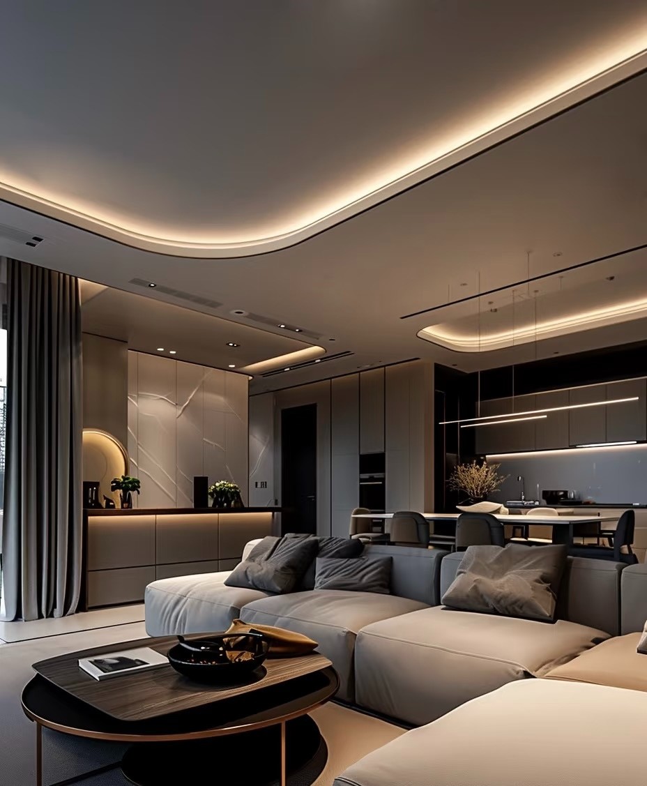 这套住宅空间以高级灰为主色调,营造出沉稳、静谧的氛围。客厅采用无主灯设计,线条灯勾勒空间轮廓,搭配大尺寸沙发与简约茶几,开阔通透。开放式餐厨区与客厅相连,一体化布局增强互动性,橱柜内置灯带提升精致感。卧室延续整体风格,简洁的柜体、柔和的灯光,搭配舒适床品,尽显现代简约与轻奢质感,空间利用合理,尽显大气雅致 。
