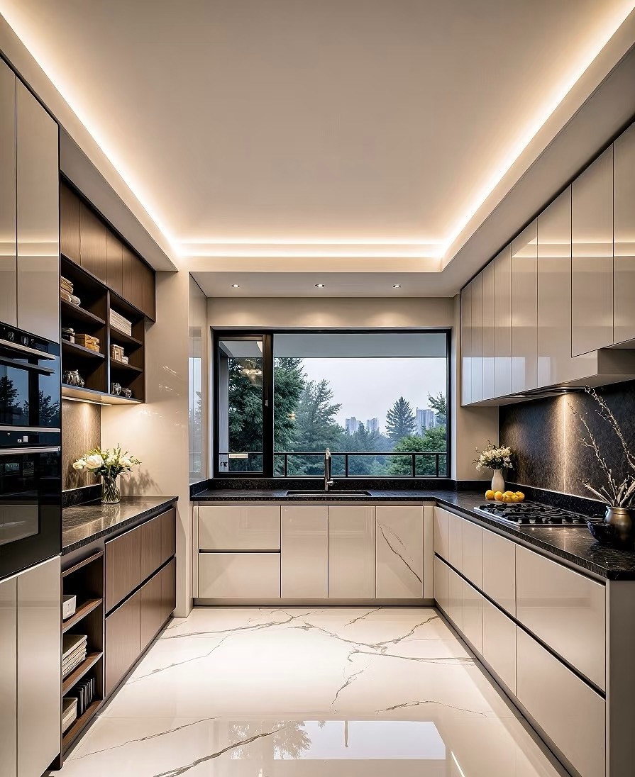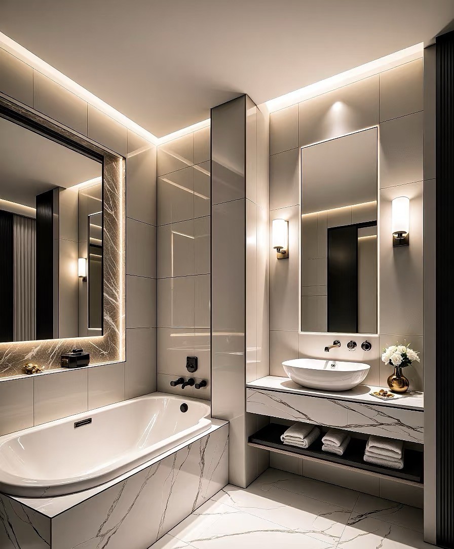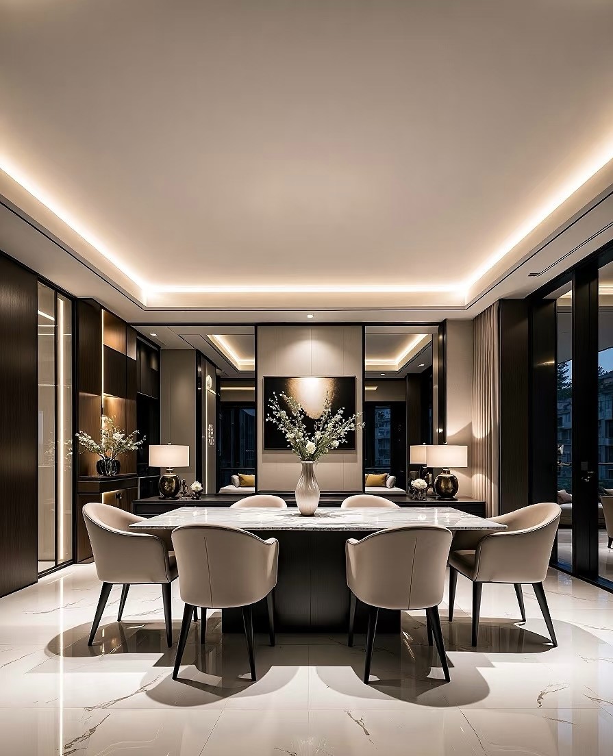这套住宅空间设计呈现现代简约与高级质感的融合。以黑白灰为主色调,搭配柔和灯光,营造静谧优雅氛围。客厅线条利落,沙发、茶几与背景墙相得益彰;餐厅布局规整,大理石餐桌显精致;卧室简洁舒适,灯光营造温馨睡眠环境;厨房功能与美观兼具,大窗引入自然景致;浴室精致有序,细节尽显品质,整体打造出时尚且宜居的家居空间。
