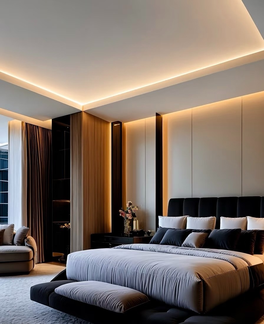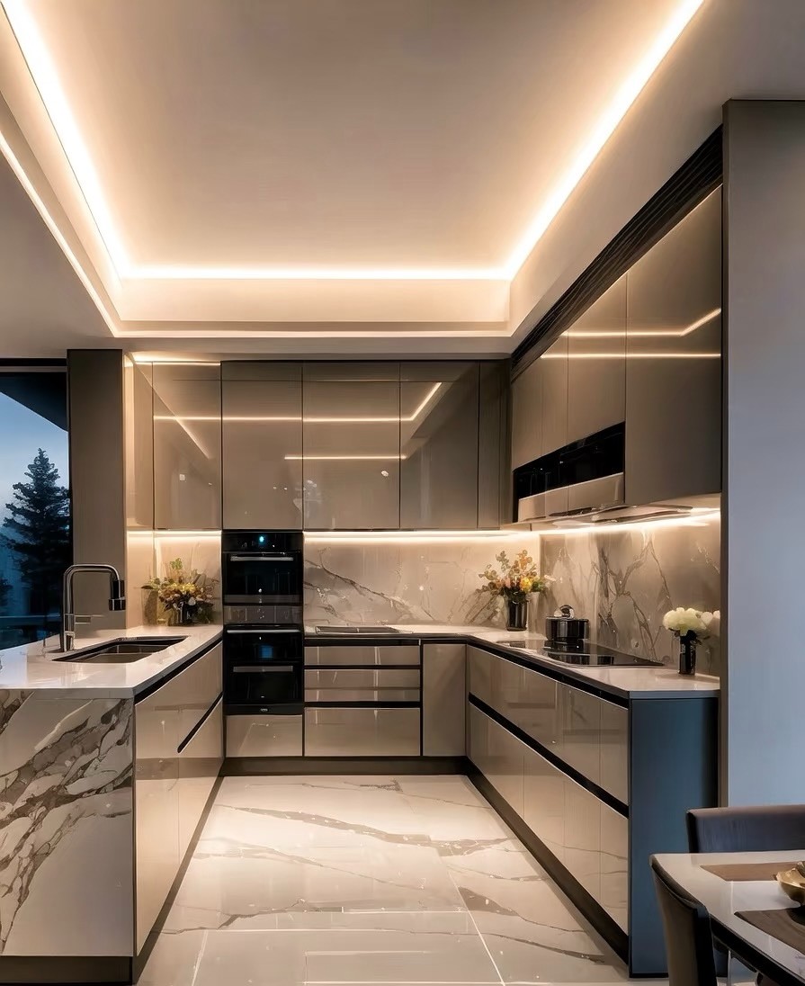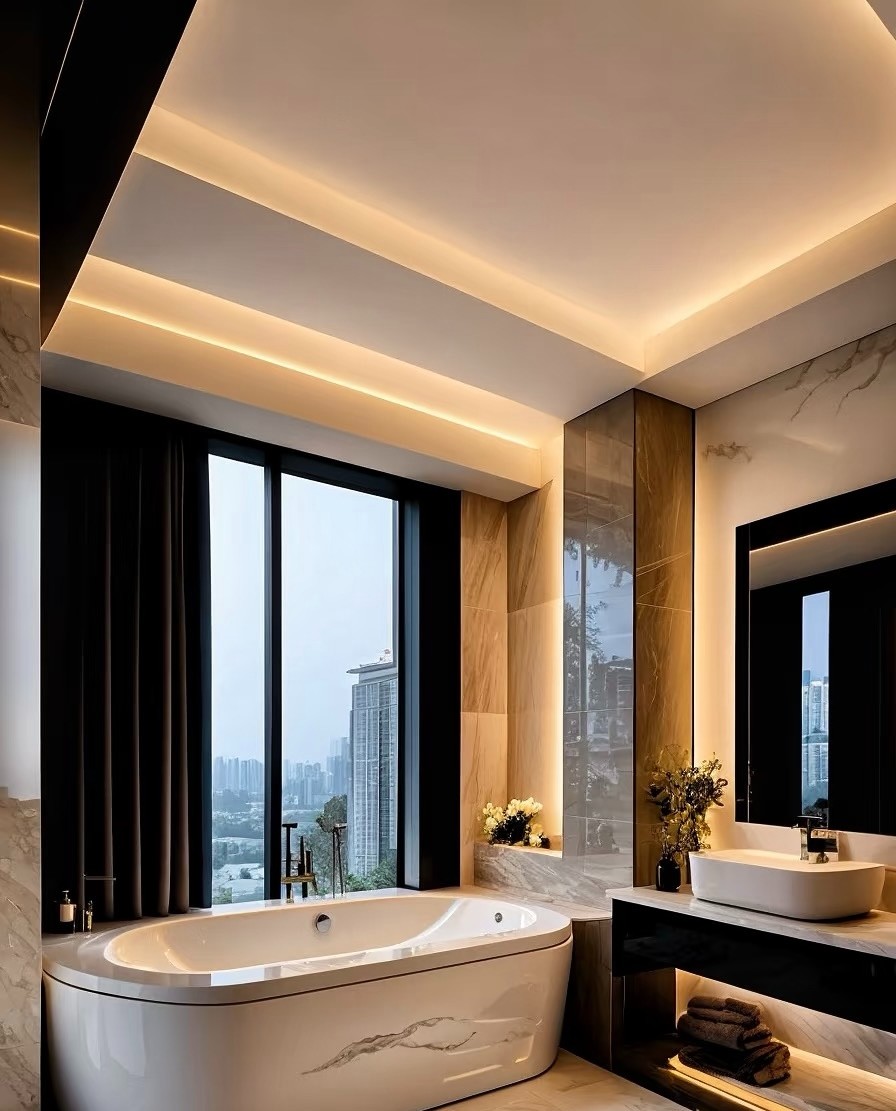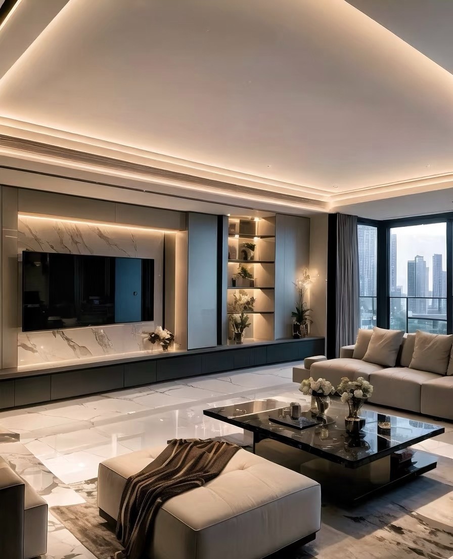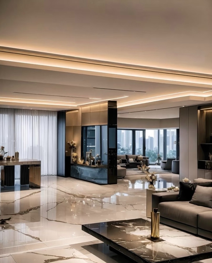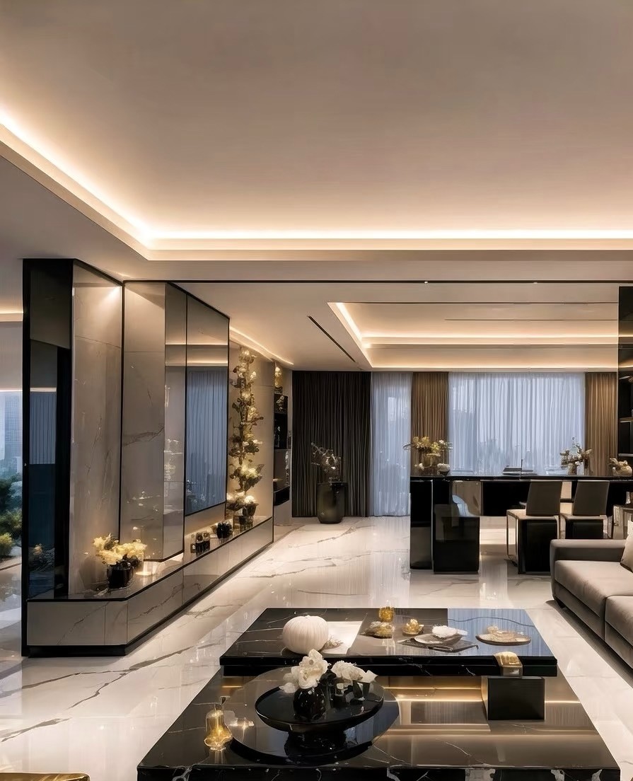 这是现代轻奢风格家装案例,以黑白灰为主色调,融入金属、大理石元素。客餐厅空间开阔,悬浮吊顶配线性灯,通透高级;大理石地面延伸视觉,沙发、茶几简约大气。卧室利用线条灯营造温馨氛围,床头背景墙精致。厨卫区橱柜与电器一体化,大窗引入光线,兼具实用与美观,整体诠释出简约而不失奢华的居住格调。