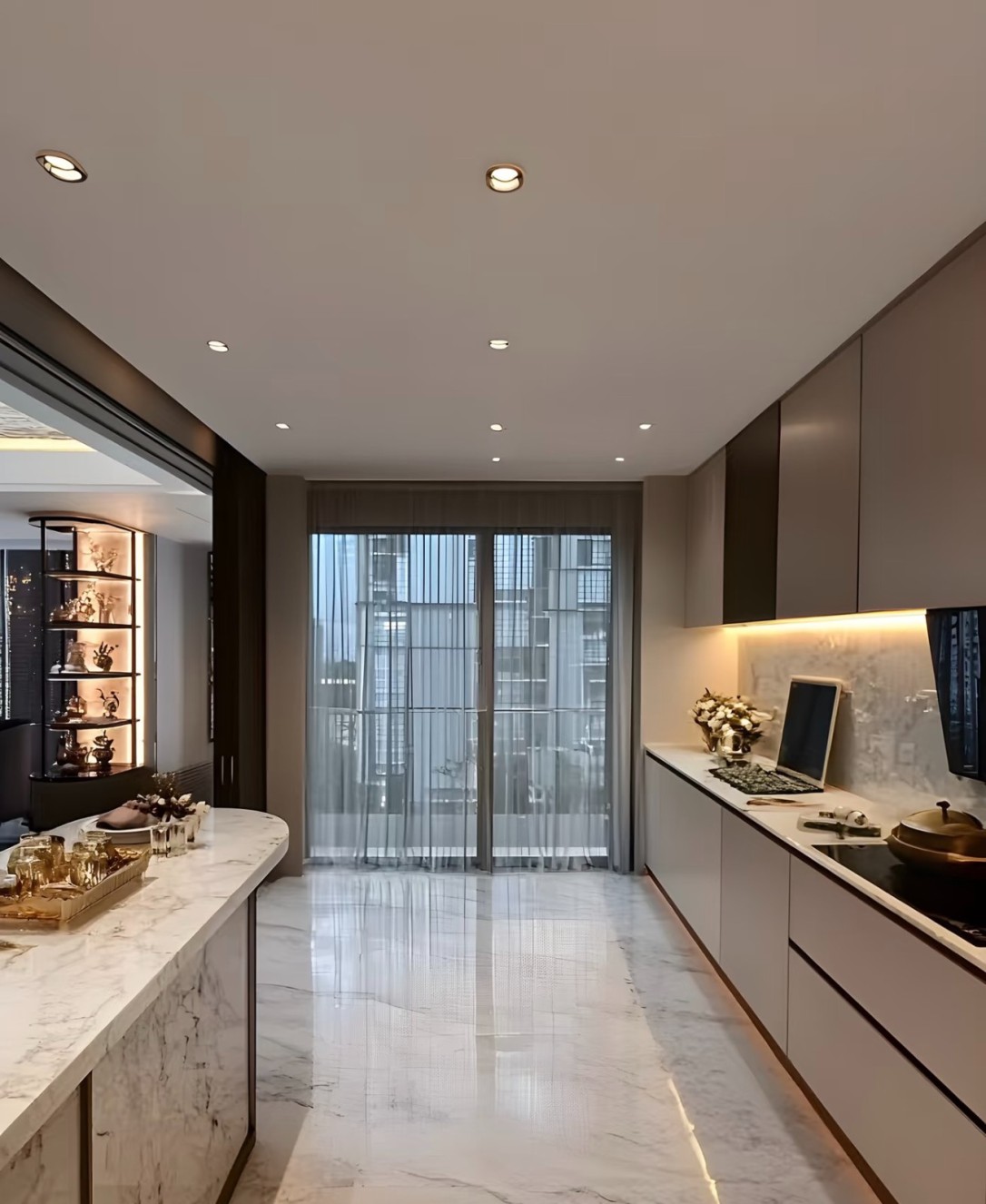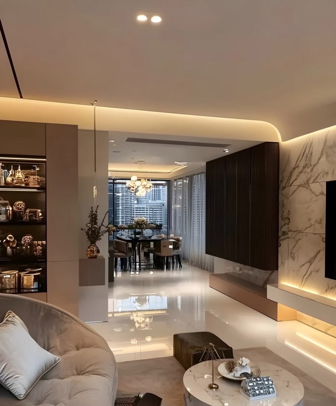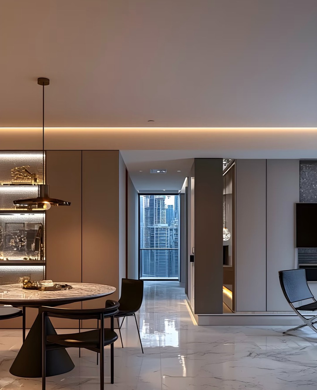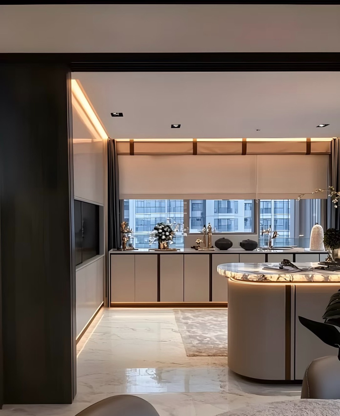 这是一套现代简约风格的室内设计案例,涵盖餐客厅、厨房、卧室等空间。整体以浅灰、米白为主色调,搭配深色柜体,简洁大气。灯光设计巧妙,暗藏灯带营造温馨氛围,造型独特的吊灯成为空间亮点。大理石地面与墙面提升质感,大面积玻璃窗引入充足光线,借景城市风光,软装搭配精致,花束、摆件增添生活气息,打造出舒适且具格调的居住环境 。