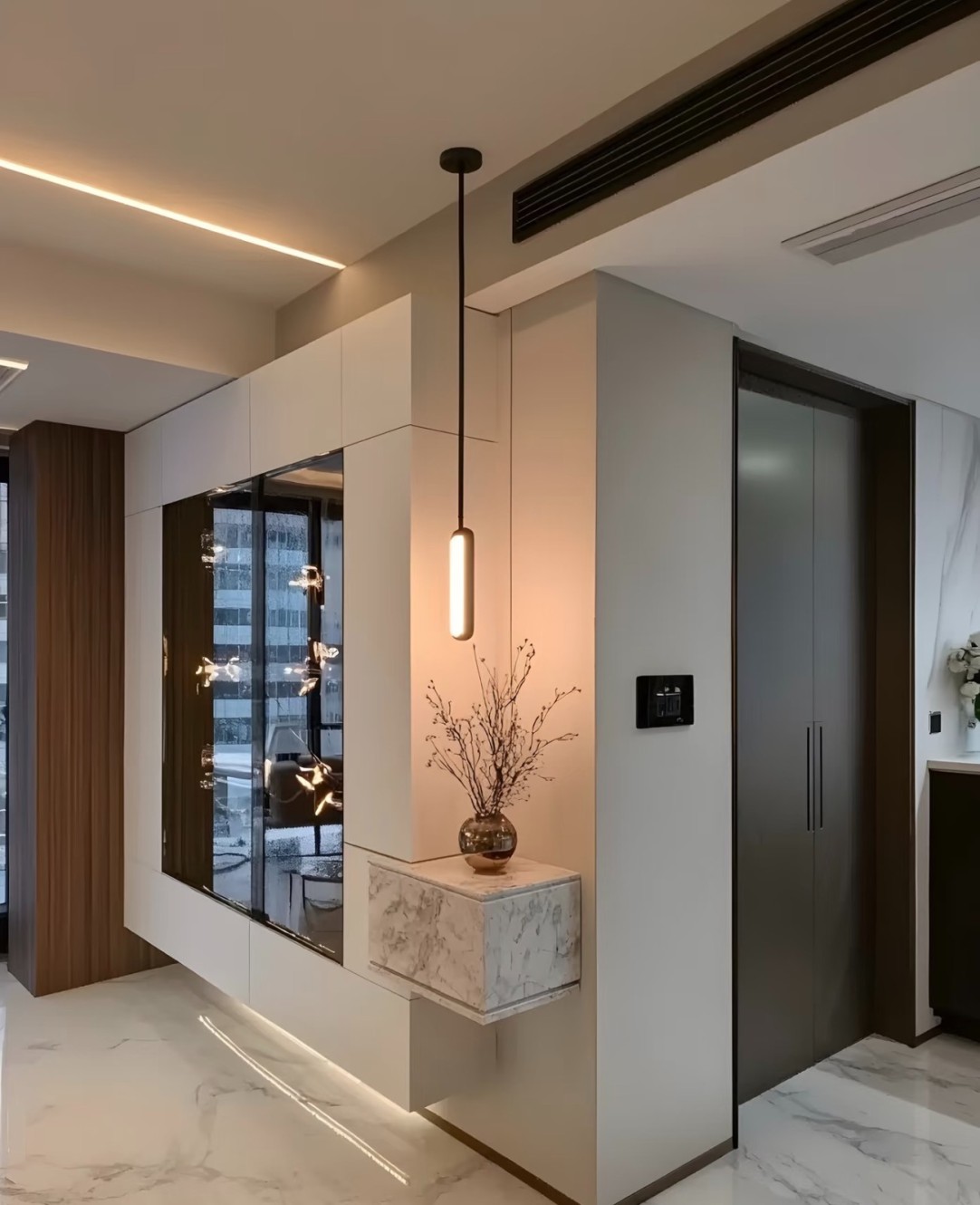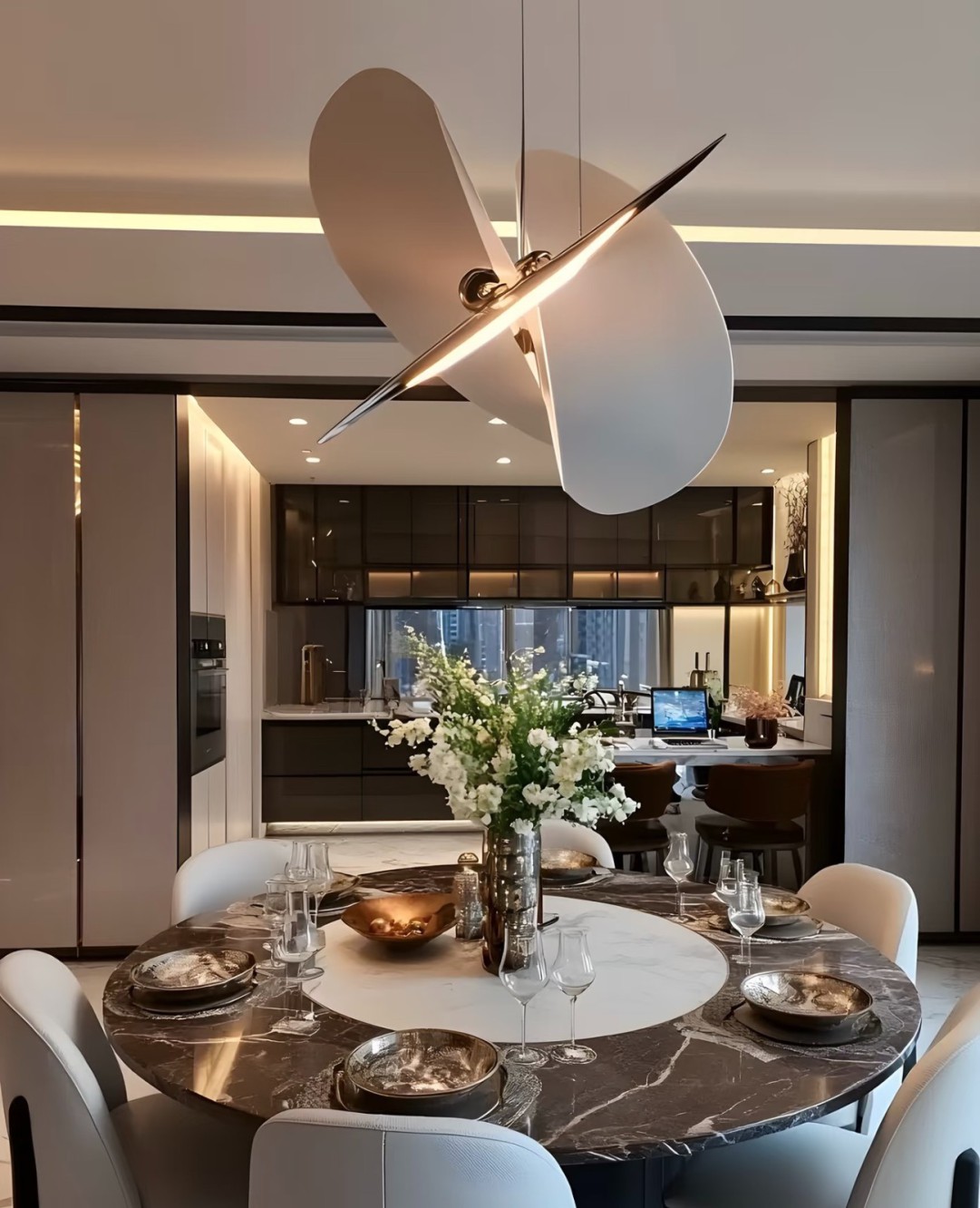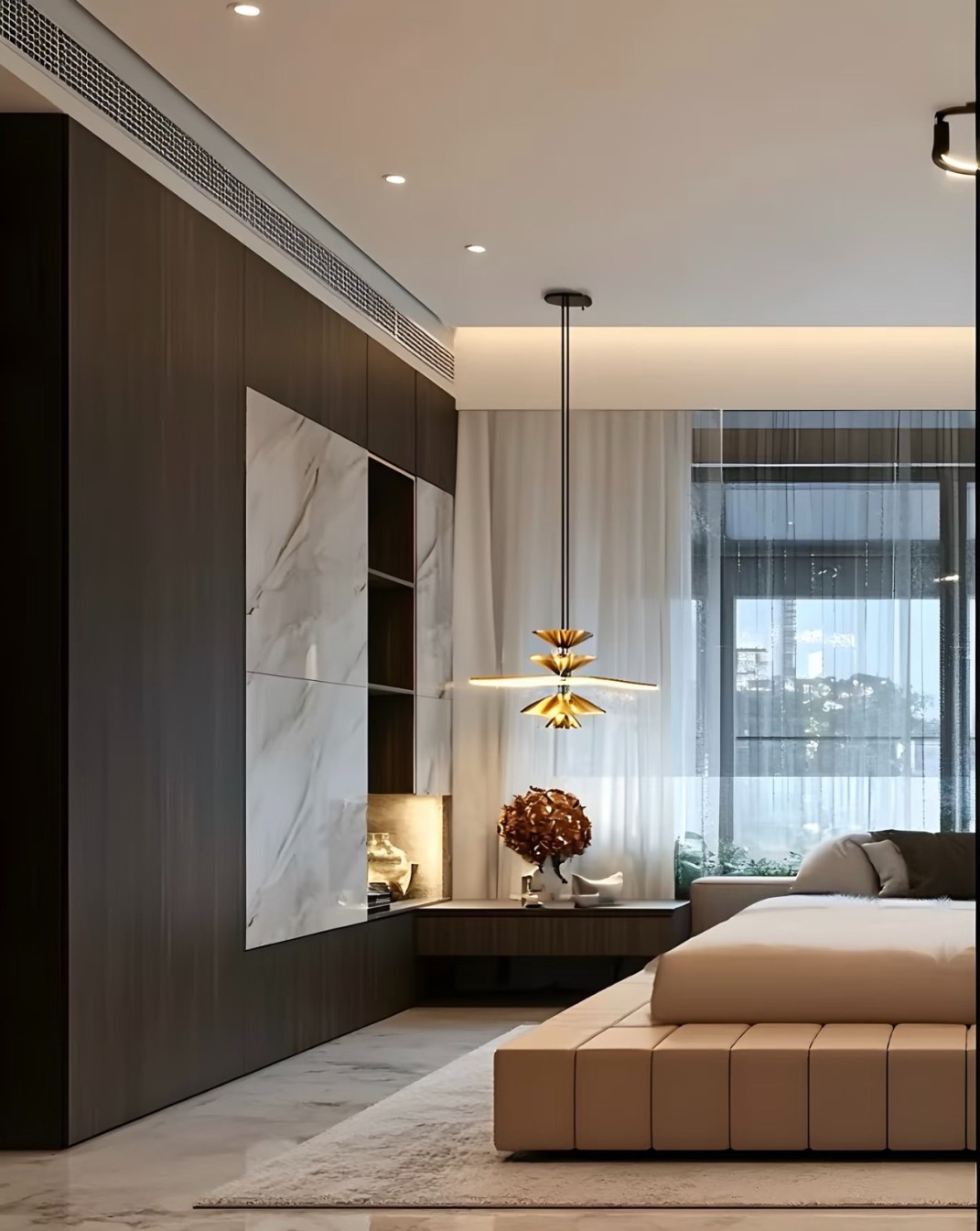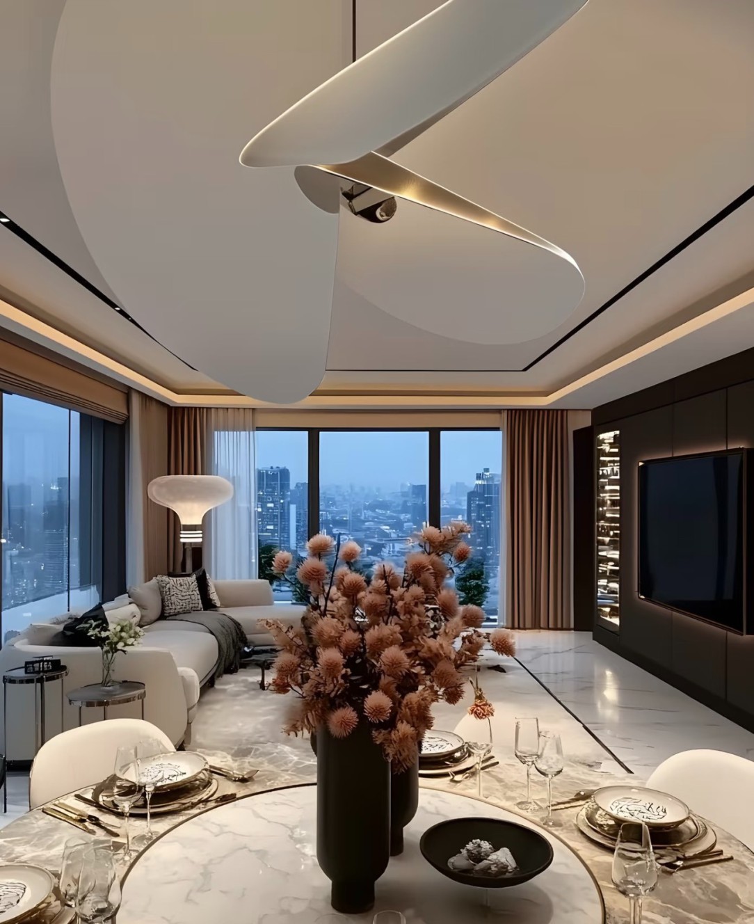 这是一套现代简约风格的室内设计案例,涵盖餐客厅、厨房、卧室等空间。整体以浅灰、米白为主色调,搭配深色柜体,简洁大气。灯光设计巧妙,暗藏灯带营造温馨氛围,造型独特的吊灯成为空间亮点。大理石地面与墙面提升质感,大面积玻璃窗引入充足光线,借景城市风光,软装搭配精致,花束、摆件增添生活气息,打造出舒适且具格调的居住环境 。