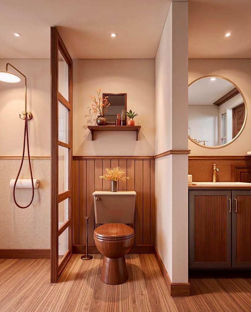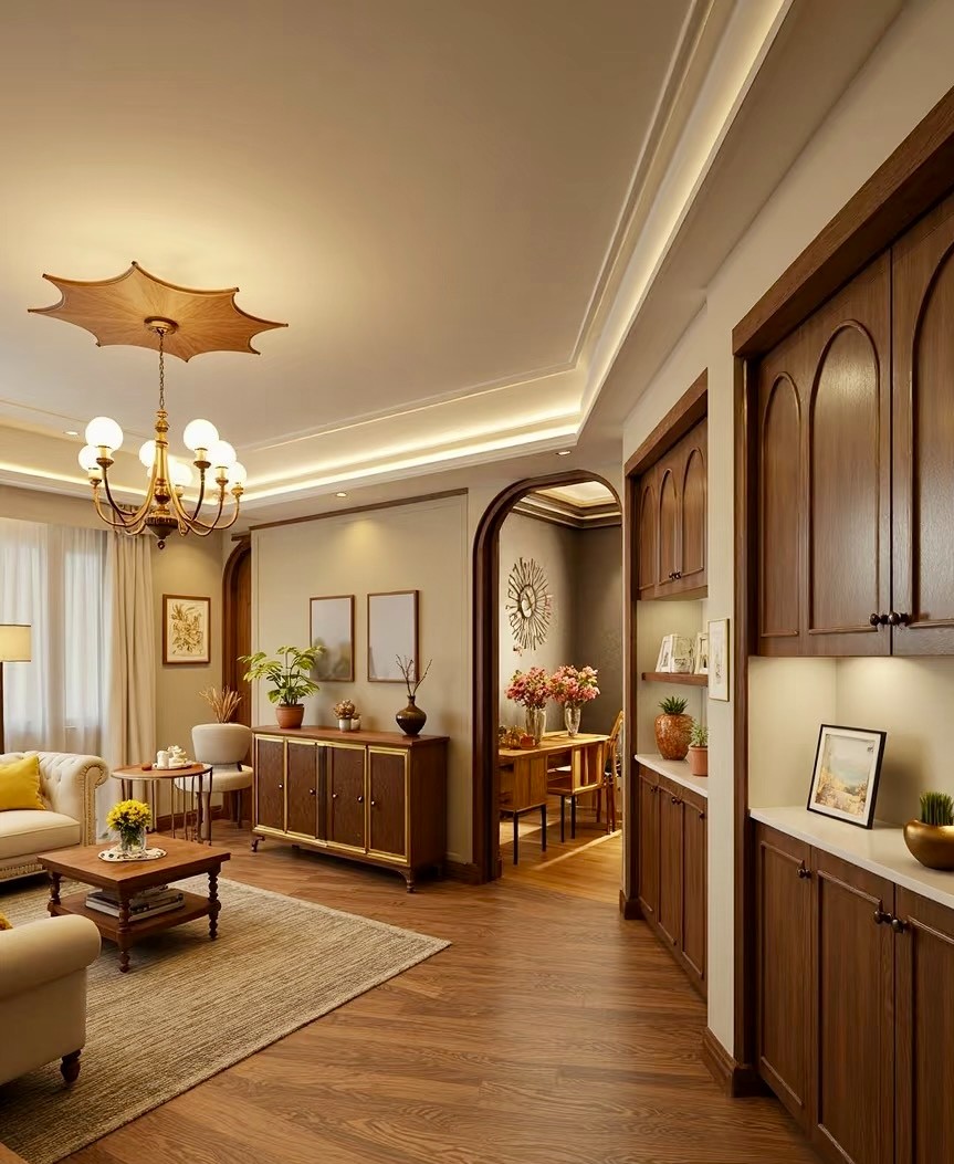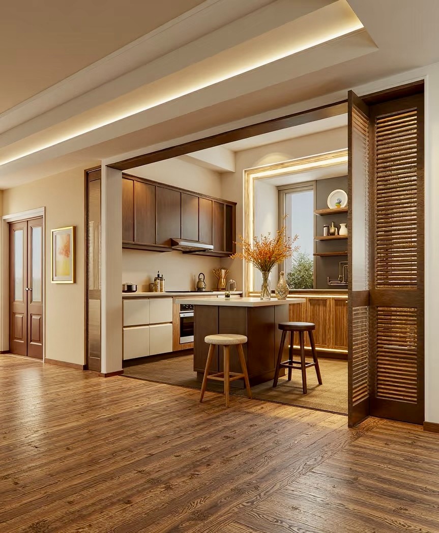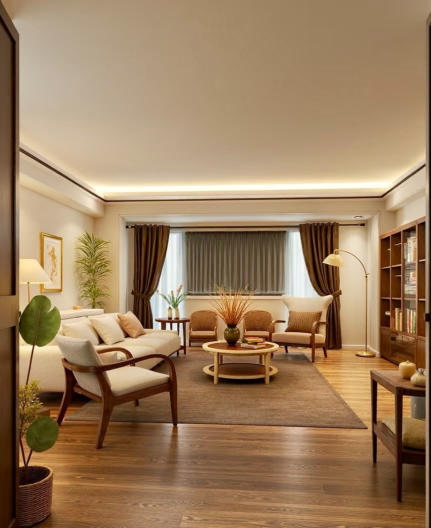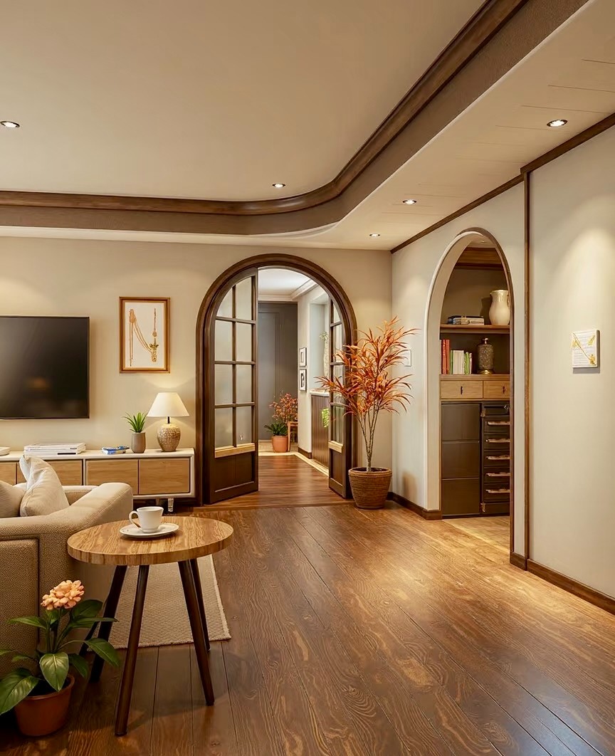 这套案例呈现多种风格融合的家居空间,涵盖客厅、厨房、卧室、卫浴等区域。以温润木质元素为主调,搭配简约流畅的线条,营造出自然温馨氛围。客厅布局开阔,沙发、绿植、灯饰搭配和谐;厨房开放式设计,岛台兼具实用与美观;卧室温馨舒适,卫浴则通过木质装饰、圆形镜等增添精致感,整体展现出舒适宜居、兼具美学与功能性的居住环境 。