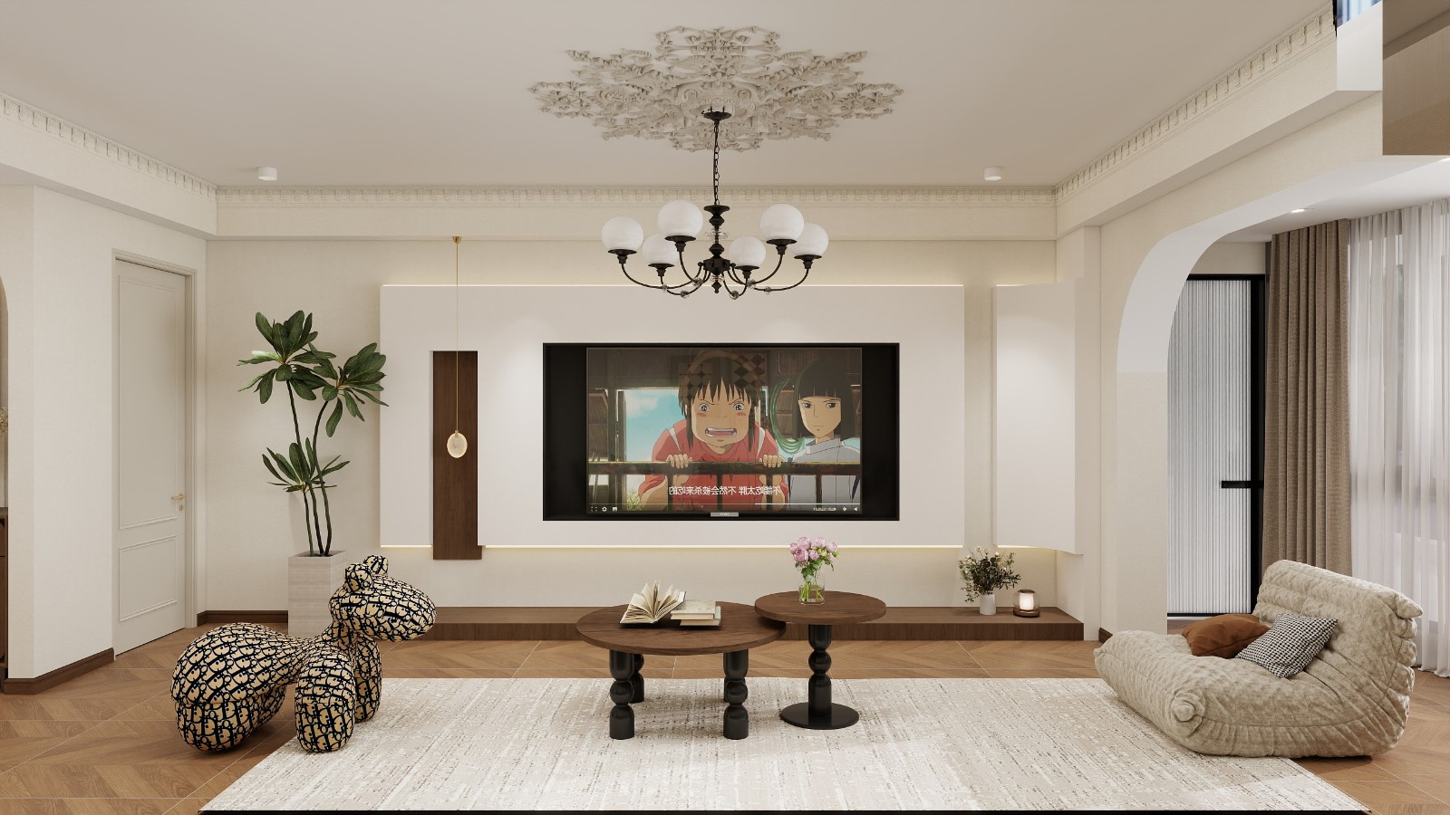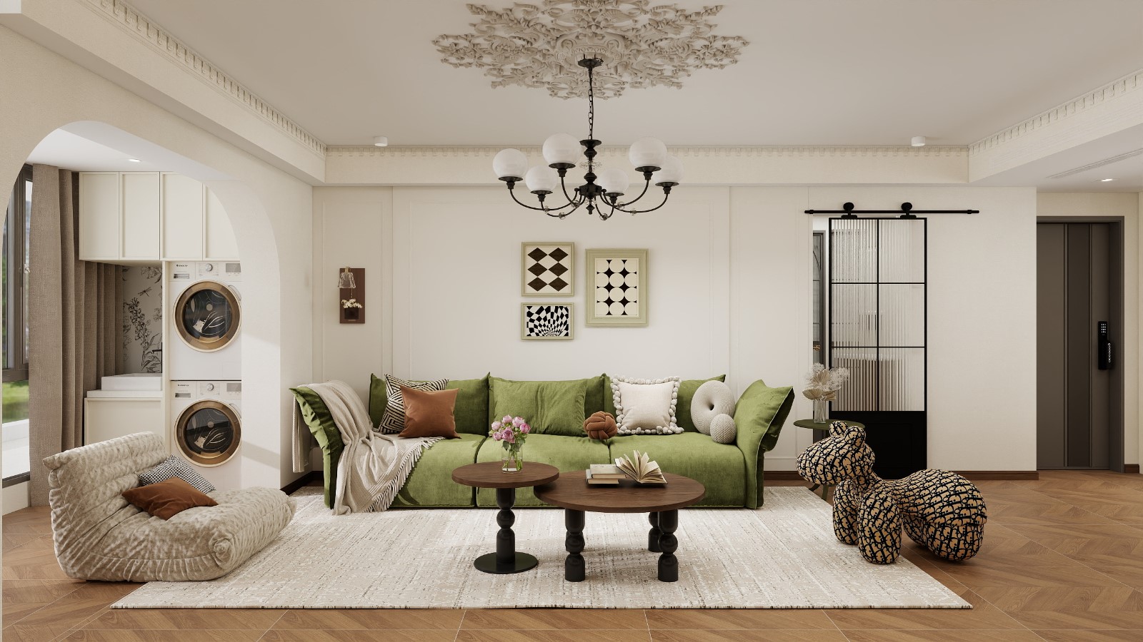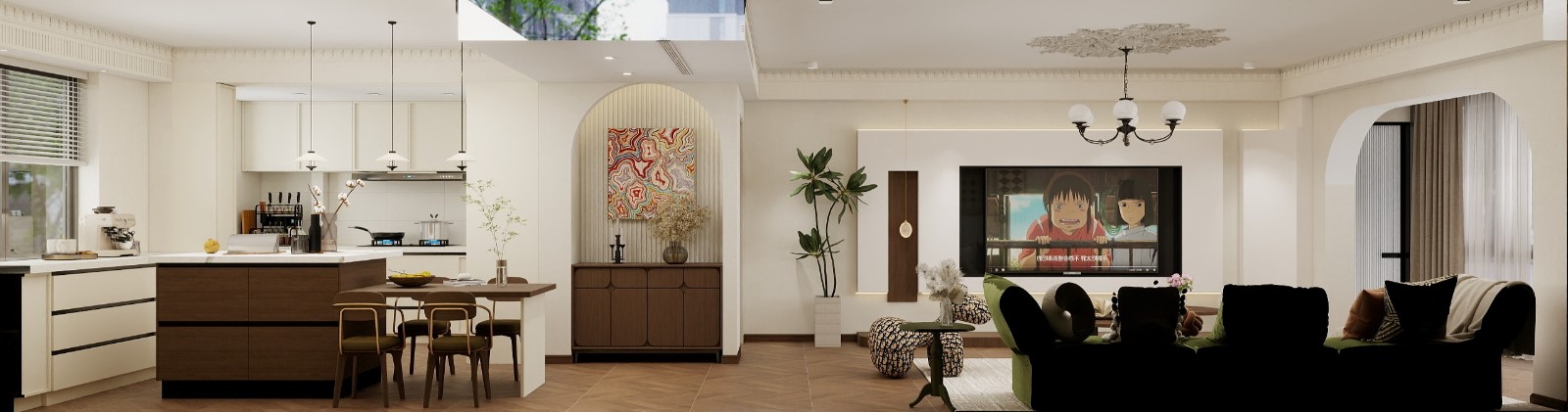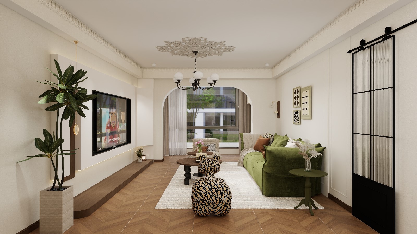 中间以拱形门洞+艺术装饰柜作为过渡,彩色抽象画与干花摆件提升了艺术氛围。右侧是客厅区域,天花板有精致的法式浮雕装饰,搭配复古多头吊灯,电视背景墙采用简洁的嵌入式设计,橄榄绿色沙发与带有品牌印花的动物造型坐凳,既柔软舒适又注入时尚趣味。地面的人字拼木地板贯穿整个空间,强化了整体的温馨质感与空间连贯性,让客、餐、厨三个区域既相互独立又能形成互动,非常适合家庭日常活动或亲友聚会