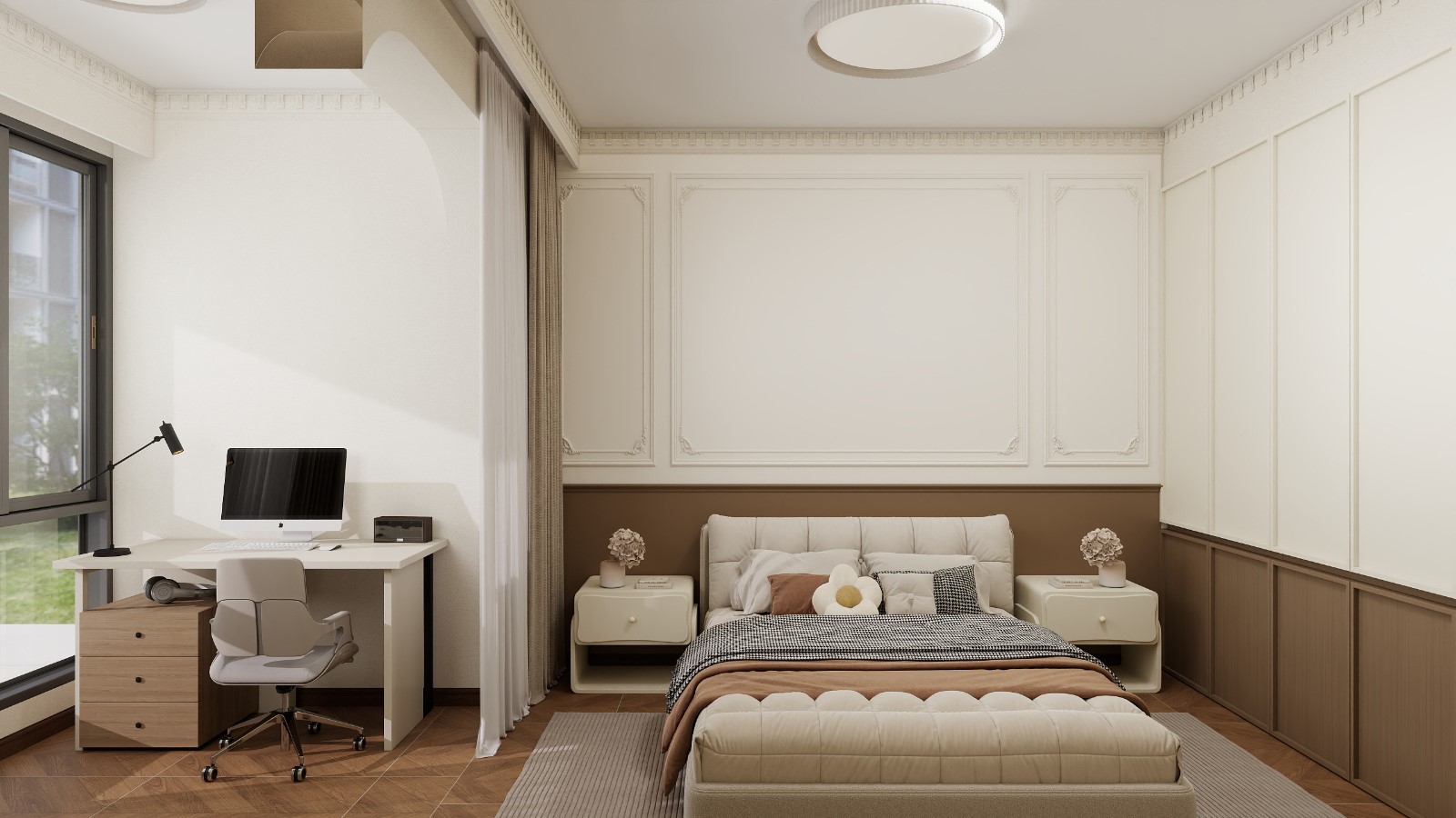 这是一间融合中古法式元素的现代简约卧室,整体以米白、浅棕为主色调,兼具优雅质感与舒适实用性,还巧妙划分出睡眠区与办公区。 墙面采用法式护墙板与雕花线条,搭配顶部的石膏线,增添了复古浪漫感;既强化了空间的温暖质感,也让区域划分更清晰,整体设计在保留法式优雅的同时,适配现代生活的多元需求。