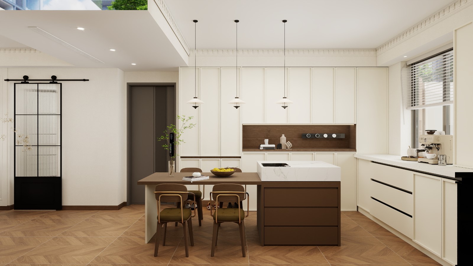 厨房采用中岛+橱柜的布局,中岛既作为料理台(带嵌入式灶眼),也承担餐桌功能,搭配四把复古木椅,方便日常用餐或社交;墙面的白色橱柜提供充足收纳,中间的棕色壁龛区域用于展示装饰摆件,增添层次感。顶部悬挂的三盏简约吊灯,为餐厨区提供重点照明;左侧的黑色谷仓门(带玻璃与金属线条),既起到空间隔断作用,又因复古造型提升了设计感。右侧操作台上还摆放着咖啡机等小家电,满足精致生活需求,整体设计让烹饪、用餐场景更具互动性与氛围感。