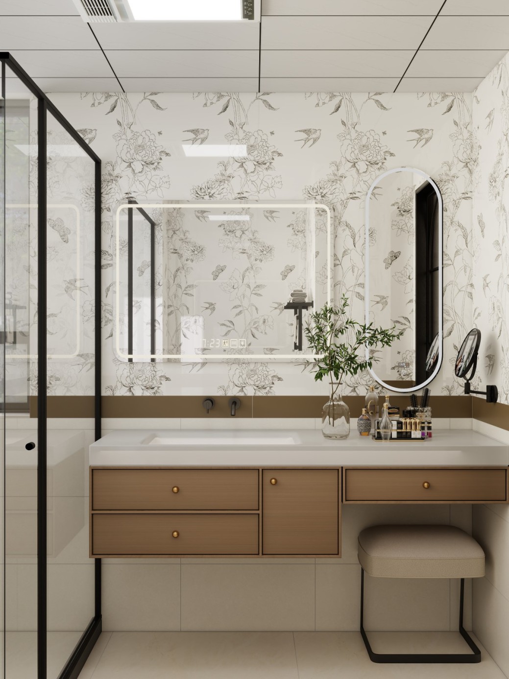 这是一间融合新中式与现代风格的浴室(含洗漱、化妆功能区),整体以米白、浅棕为主色调,通过花鸟元素瓷砖与简约卫浴设计,营造出雅致又实用的氛围。 墙面采用花鸟图案的艺术瓷砖,带有中式传统美学韵味;洗漱区配备带灯光的智能镜柜,下方的浅棕色木质柜体兼顾收纳与颜值,台面上摆放着绿植、香氛、化妆品等,让日常洗漱、化妆更具仪式感。右侧的椭圆形化妆镜与米色坐凳,形成独立的化妆角落;左侧是黑色边框的玻璃淋浴房,实现干湿分离。保障了空间的实用功能,整体设计在保留中式雅致的同时,满足了现代卫浴的多元需求。