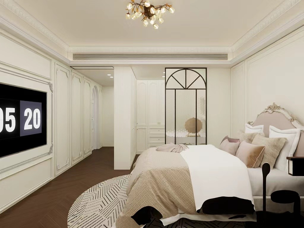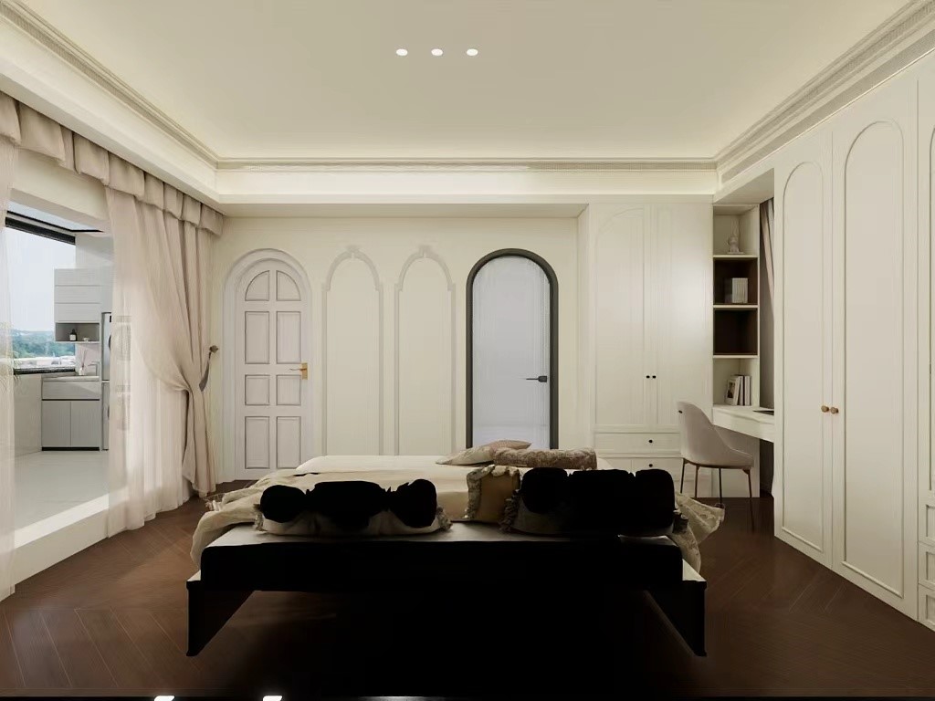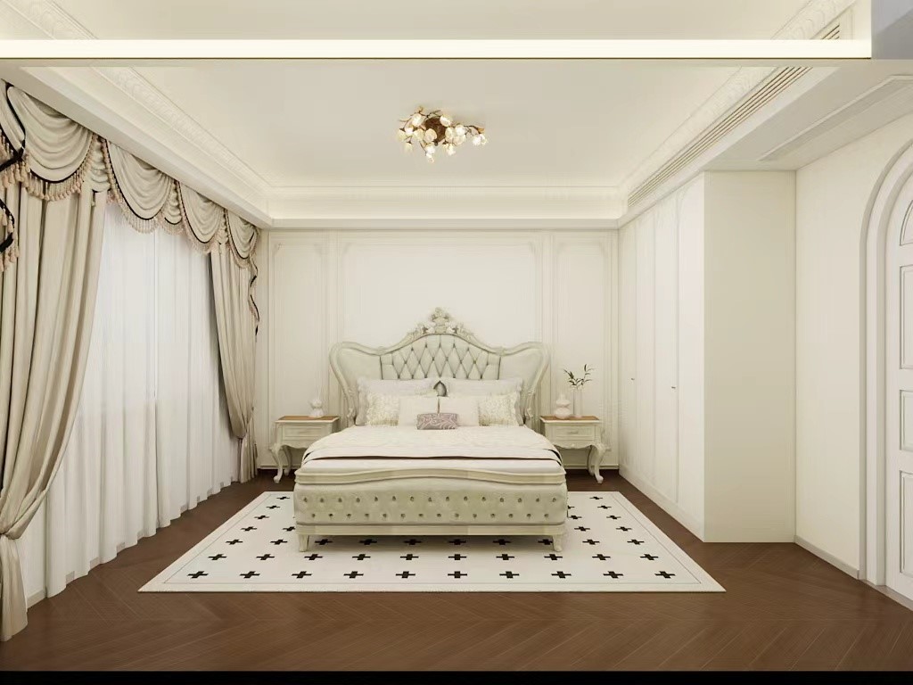 卧室中央是一张带有精致雕花和软包设计的白色大床,搭配同系列床头柜,是整个空间的视觉中心。 设计亮点 1. 色彩与材质:以米白、象牙白为主色调,搭配深棕色的人字拼地板,营造出优雅又高级的氛围。 2. 线条与造型:墙面采用了法式护墙板和精致的石膏线,床头的雕花软包、拱形门等元素,都强化了法式风格的浪漫与奢华感。