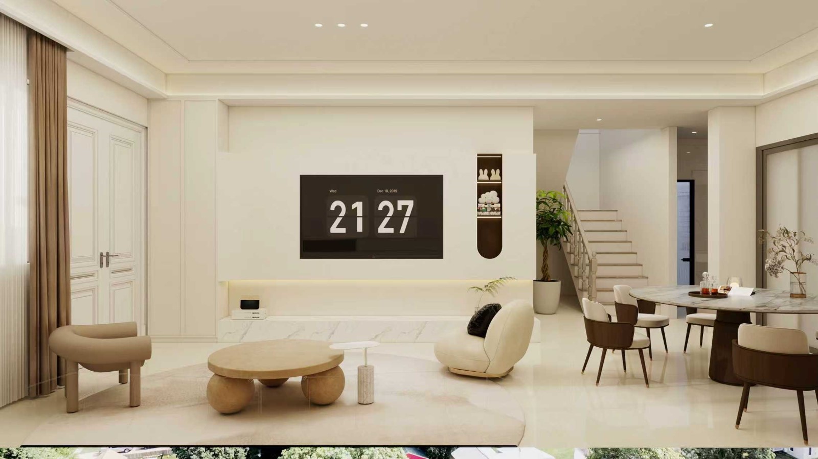 • 功能分区:电视墙采用了无主灯+嵌入式壁龛的设计,既简洁又有收纳功能;背景处的楼梯,暗示了这是一套复式或别墅户型,空间层次丰富。 • 动线设计:客餐厅一体的布局,让空间显得开阔通透,从入户门到客厅、餐厅、楼梯的动线清晰自然。