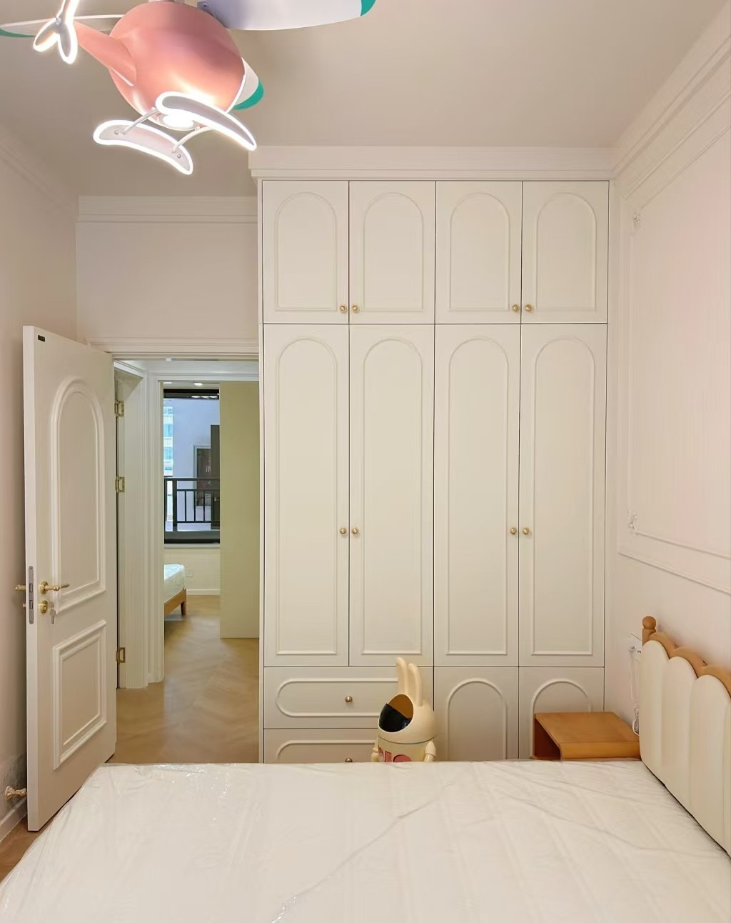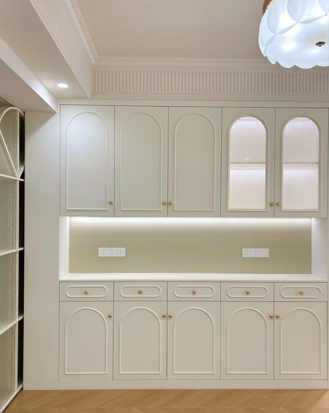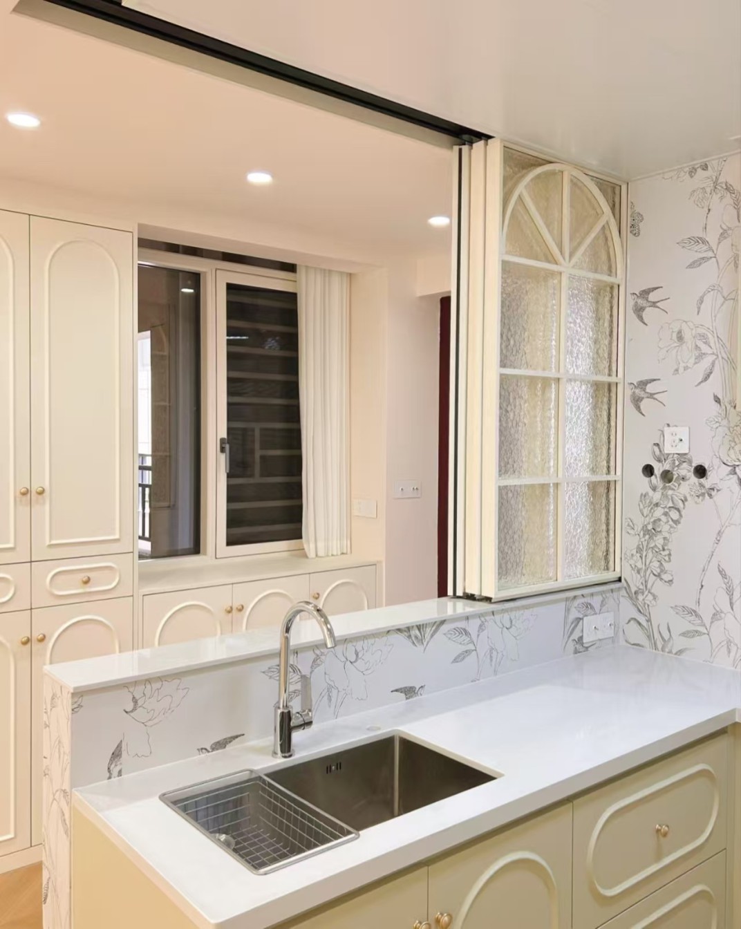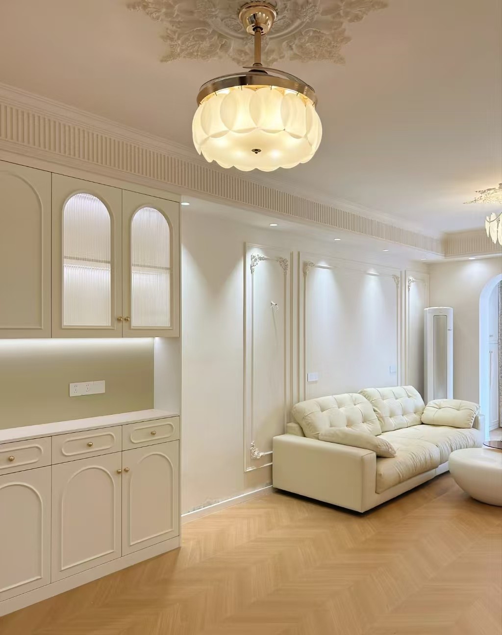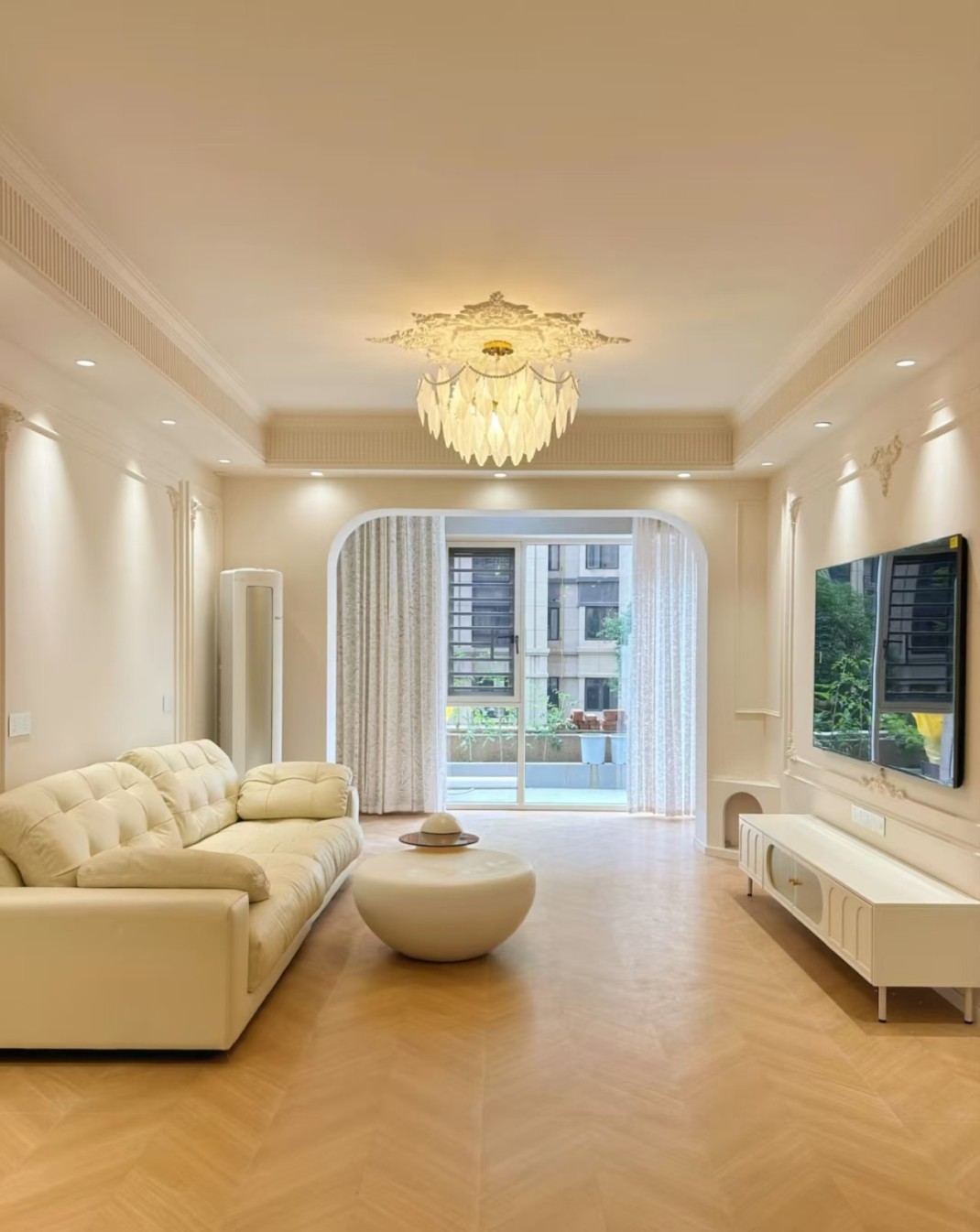本案采用法式奶油风设计,以柔和奶白为主调,搭配温润木色与细腻弧形线条,弱化棱角更显温柔。精致石膏线、柔和灯光与简约软装相得益彰,营造出浪漫优雅、温馨治愈的居住氛围,空间通透慵懒,尽显法式浪漫质感。