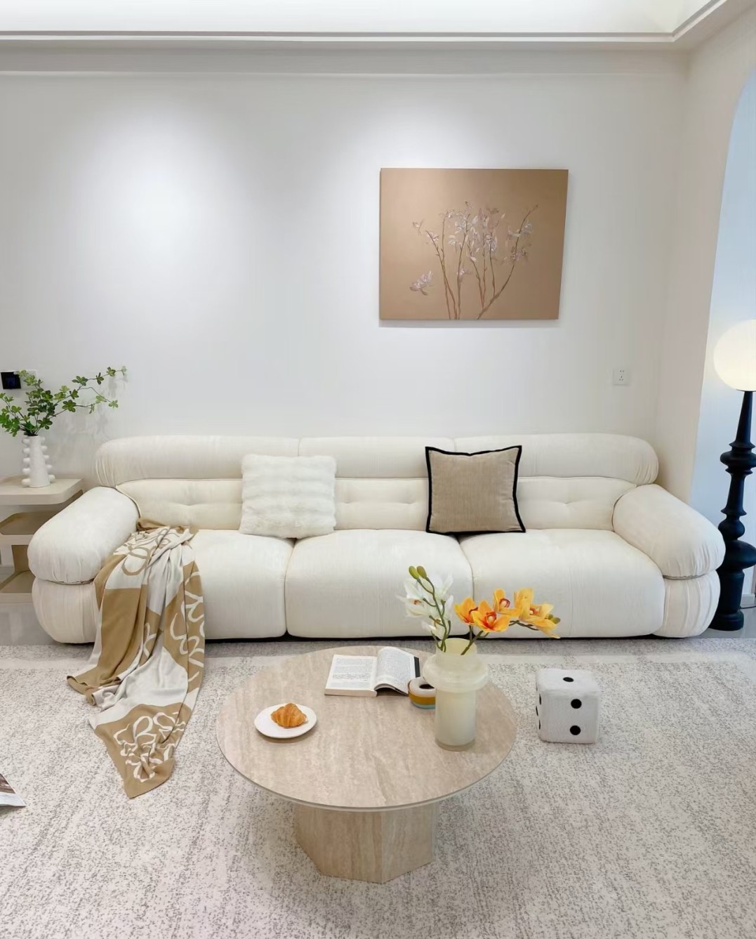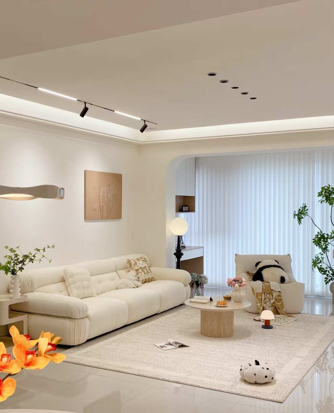 整体以柔和奶白色为主调,搭配浅杏与浅灰过渡,摒弃繁杂造型与冗余装饰。弧形垭口、无主灯设计营造温柔氛围,通顶收纳柜保证整洁通透。软装简约克制,线条干净利落,打造出慵懒治愈、干净高级又温馨舒适的现代极简家居空间。