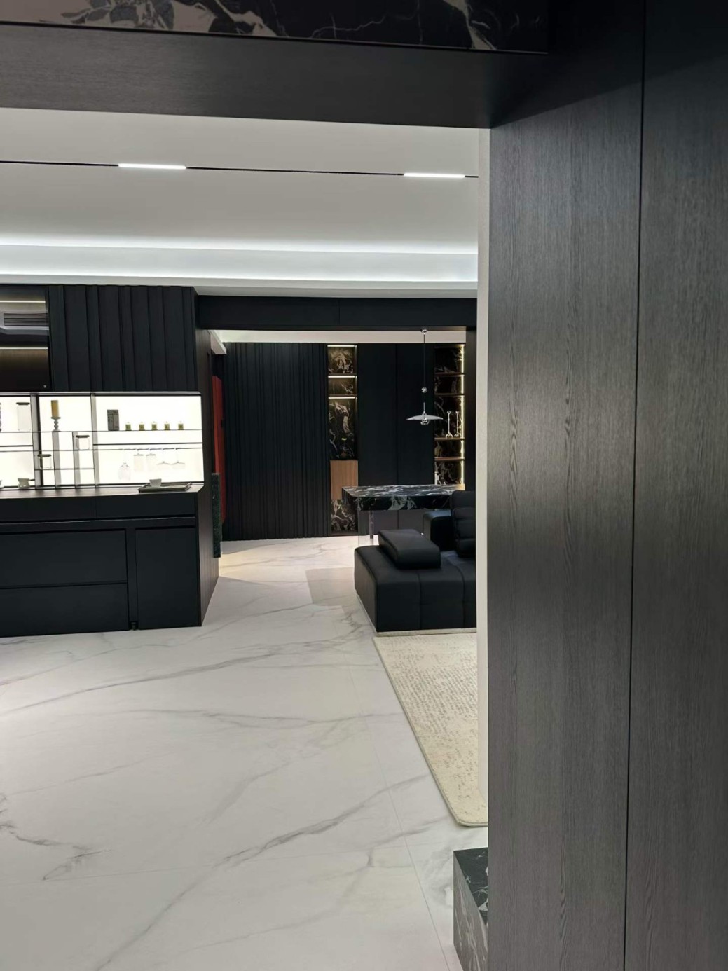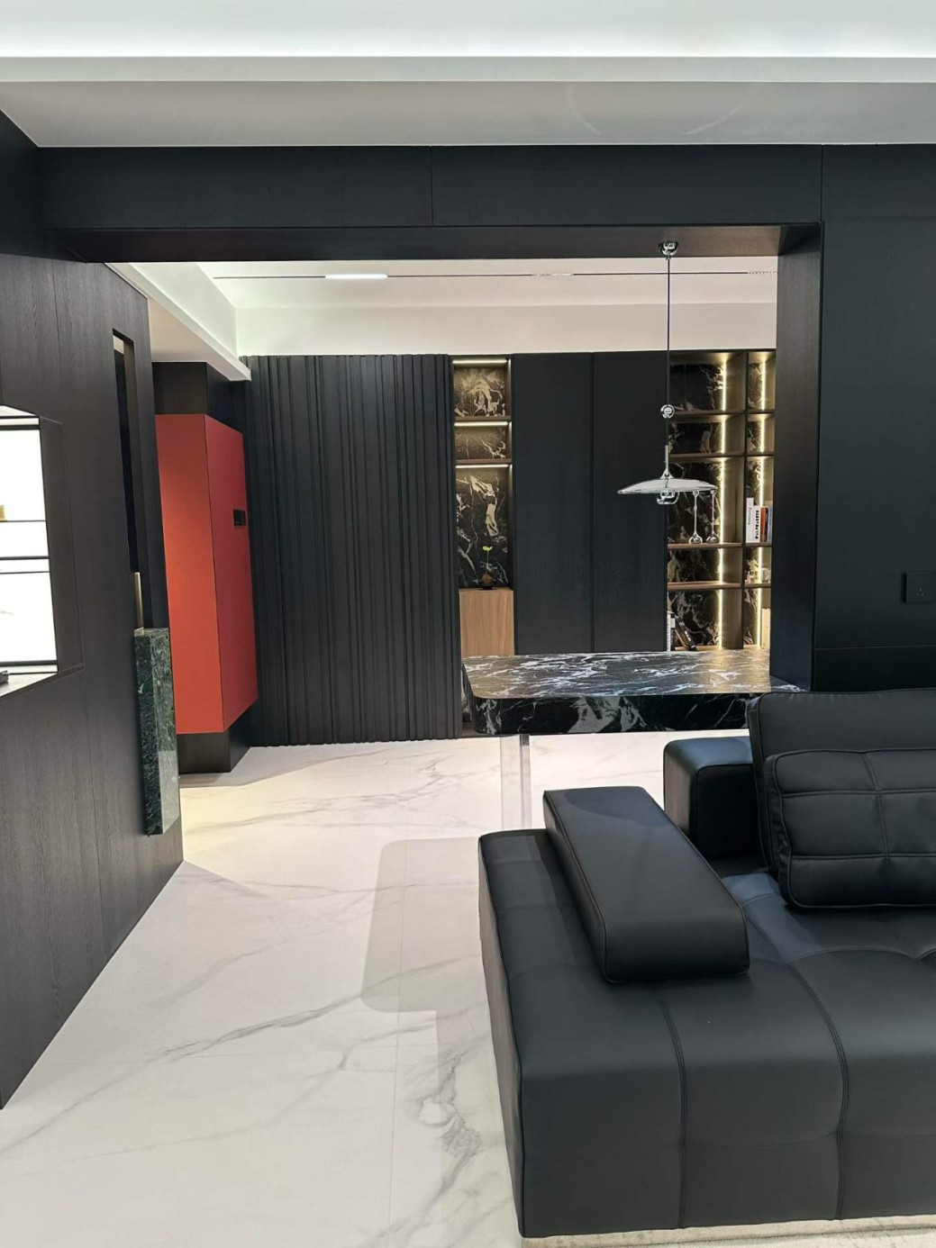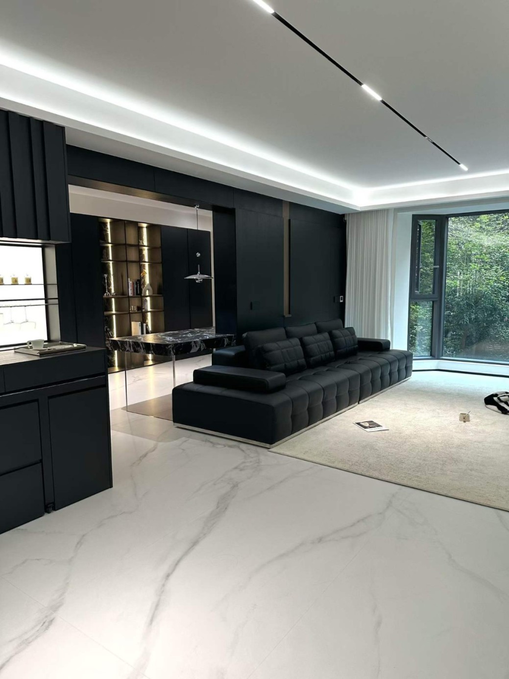 这是一套典型的极简宝格丽风格,这家业主属于小年轻,对风格和设计材料都是比较在意的,所有我们给他推荐了国货之光红绵花母婴健康板材,整体是做了一个高端工艺更能完美的展现设计与落地的美感