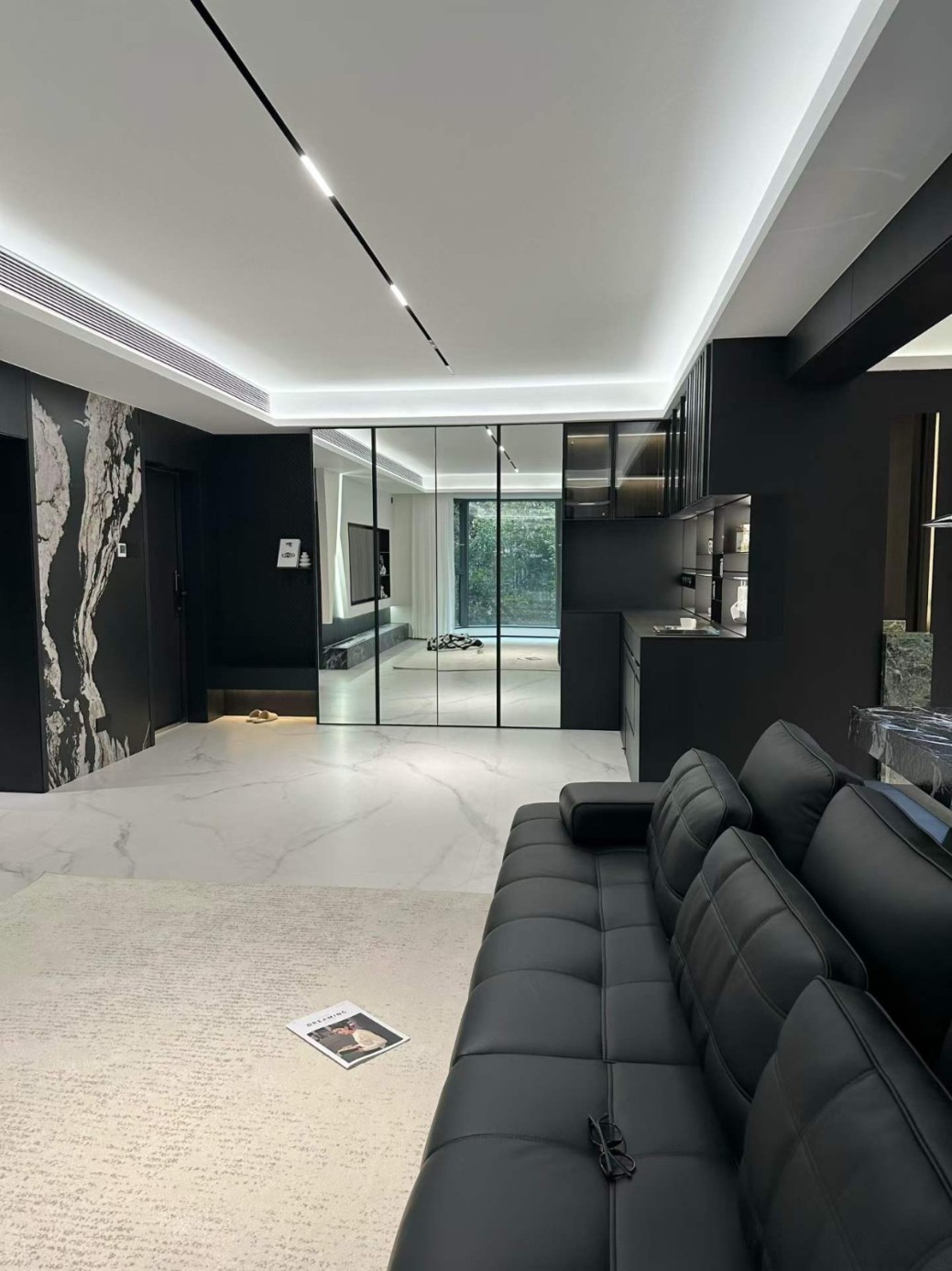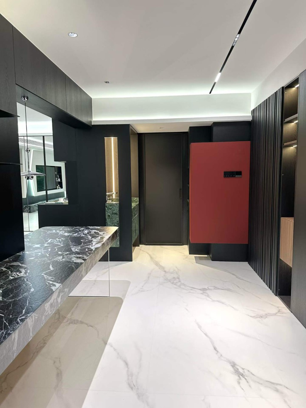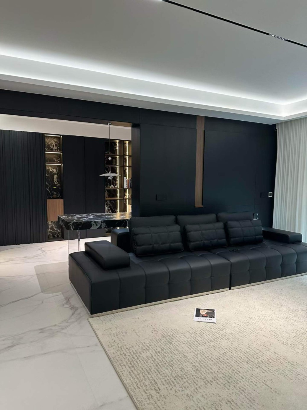这是一套典型的极简宝格丽风格,这家业主属于小年轻,对风格和设计材料都是比较在意的,所有我们给他推荐了国货之光红绵花母婴健康板材,整体是做了一个高端工艺更能完美的展现设计与落地的美感