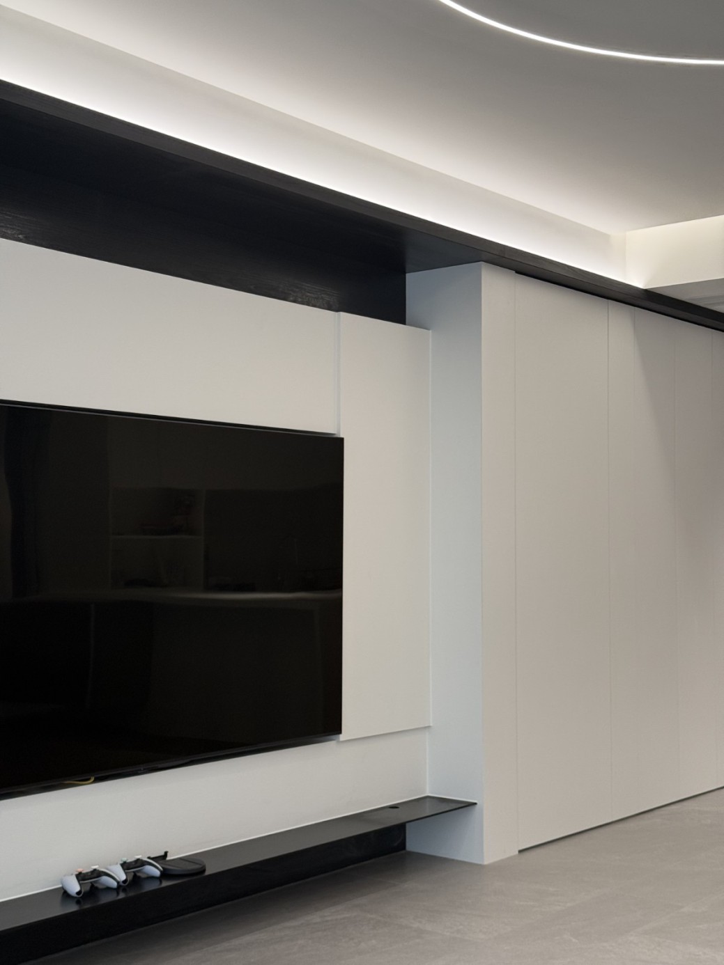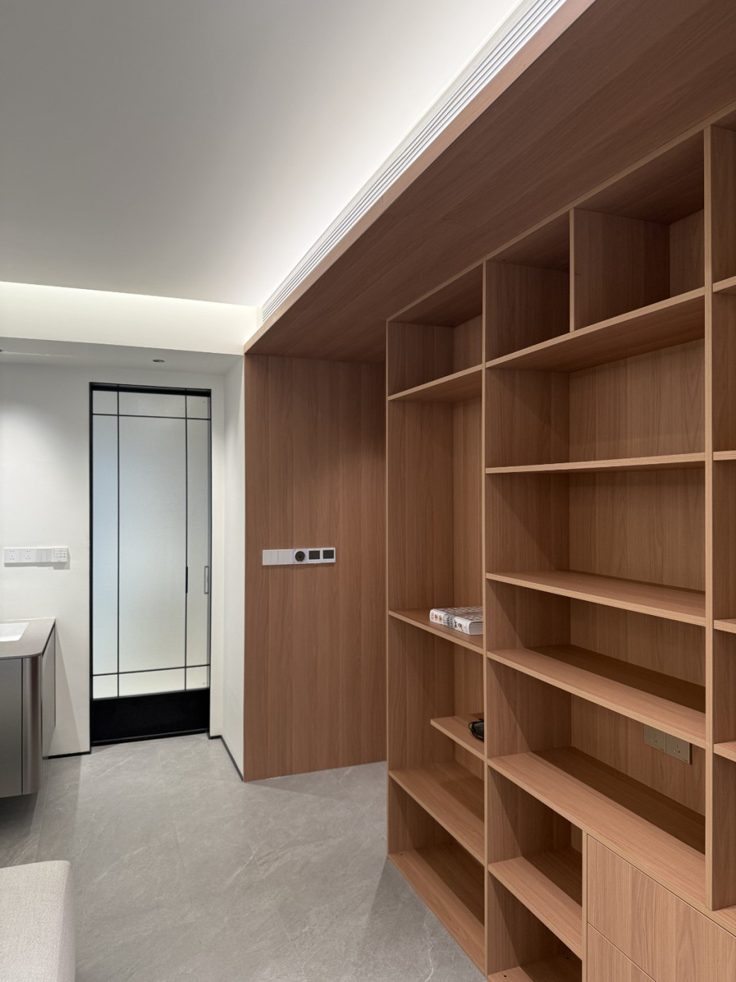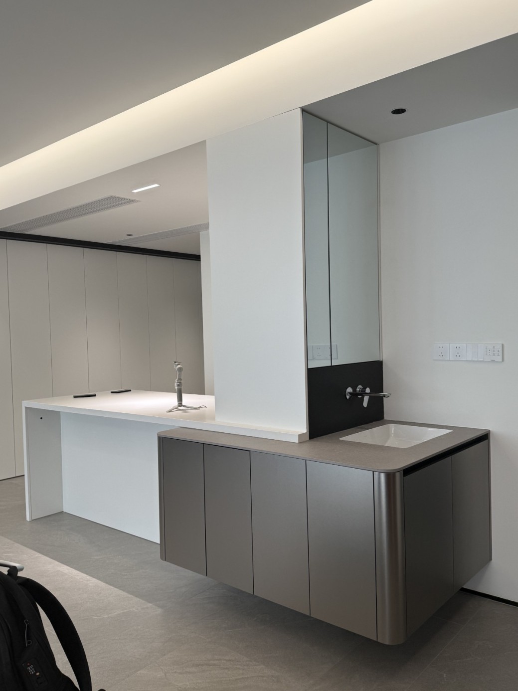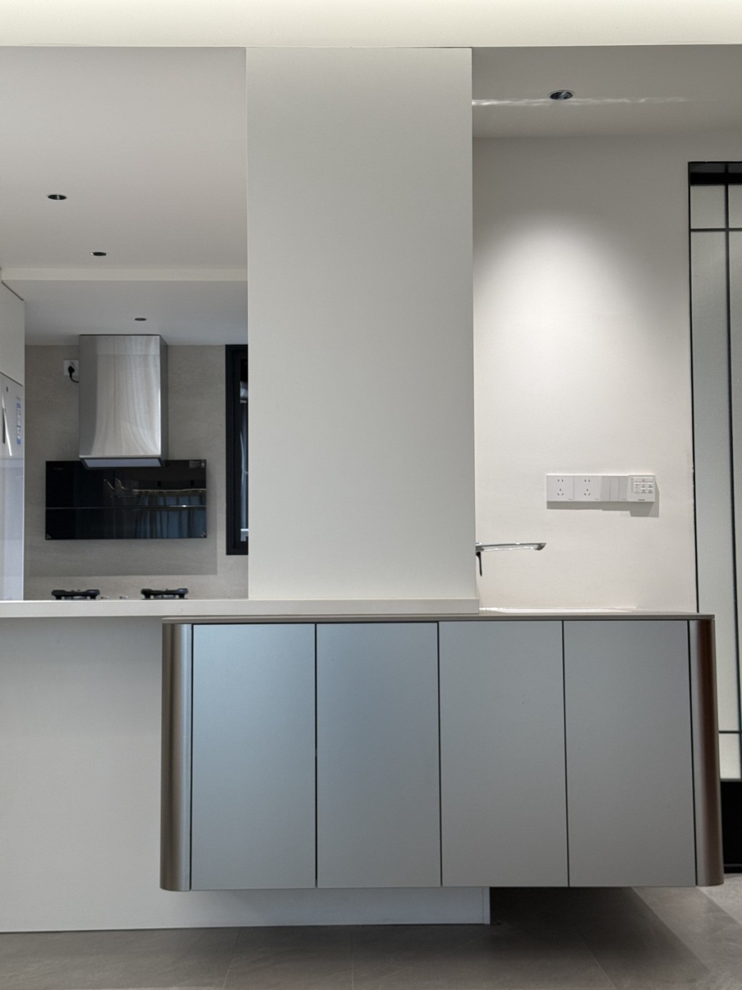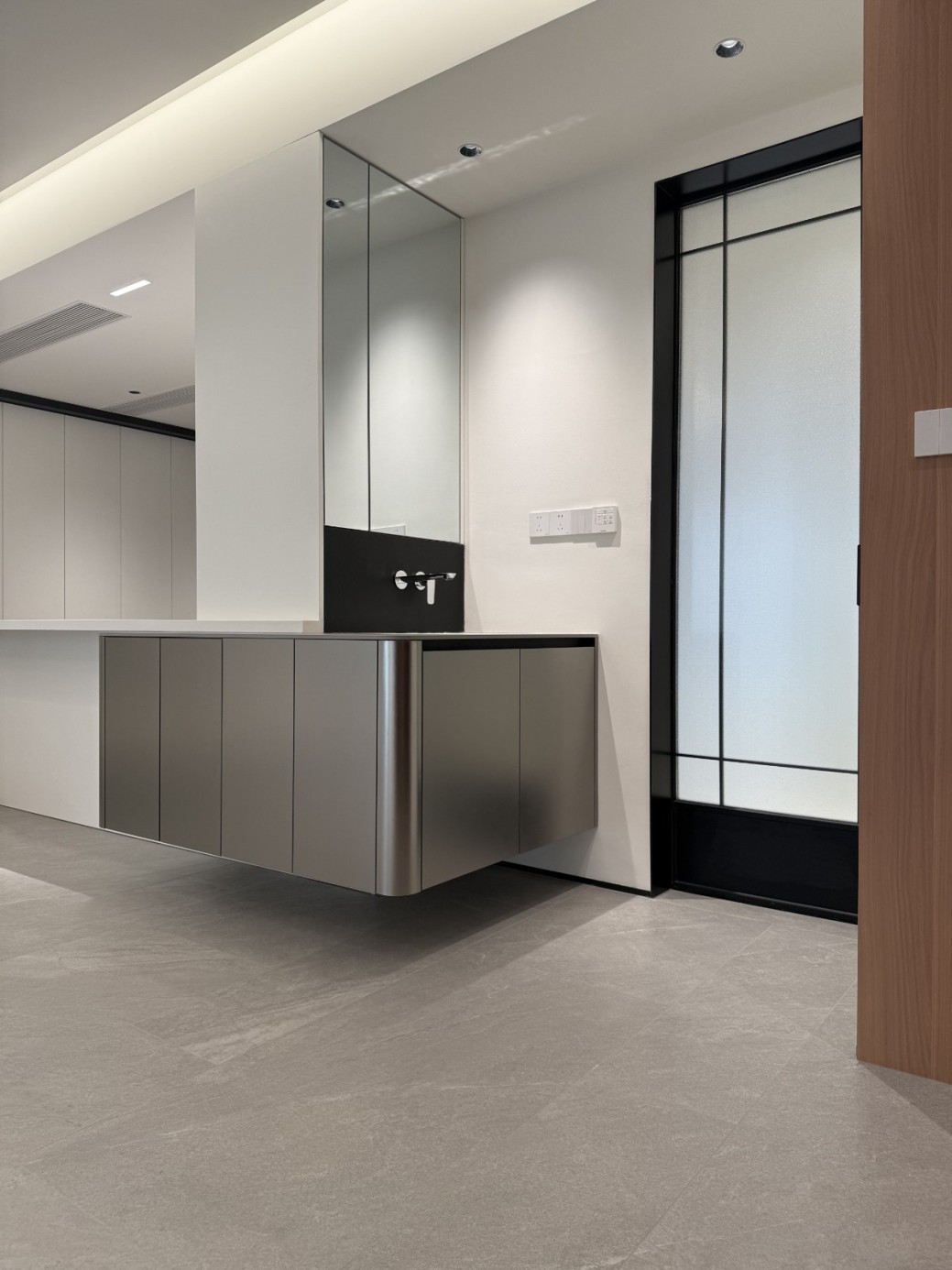 现代极简工业风的全屋定制设计,以白、灰、黑为主色调,通过无拉手的简洁柜体、利落的直线条和悬浮式安装,营造出干净通透的空间氛围。大面积纯色墙面与哑光灰色柜体形成层次对比,搭配线性灯光与玻璃隔断,弱化了柜体的厚重感,既满足了实用收纳与操作功能,又凸显出冷静克制的高级质感,完美契合现代办公或轻奢住宅对简约、利落、功能性的设计追求。