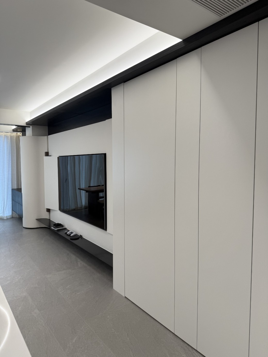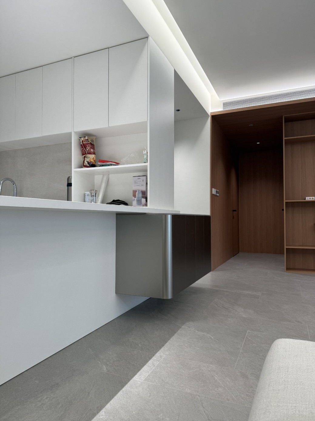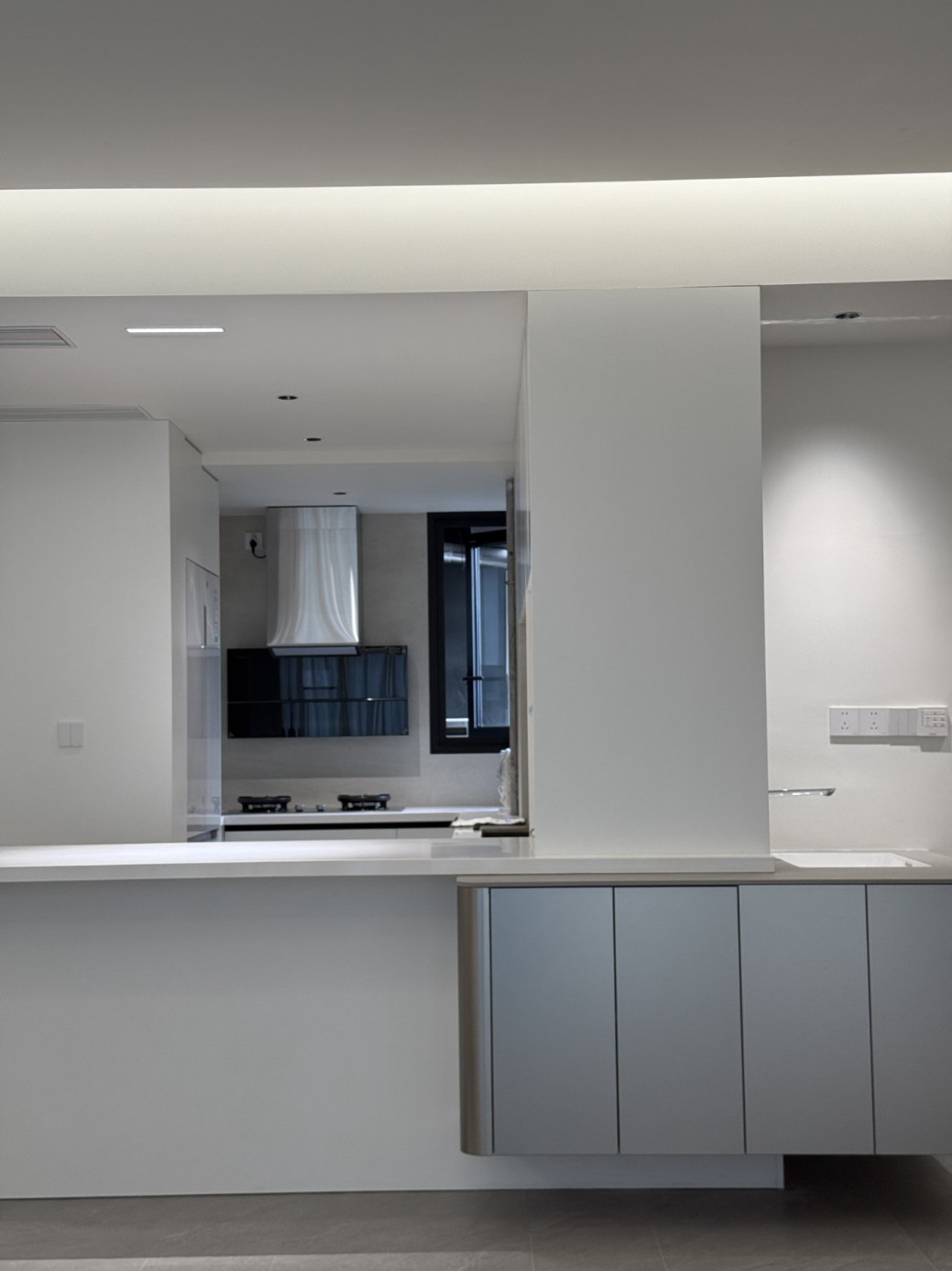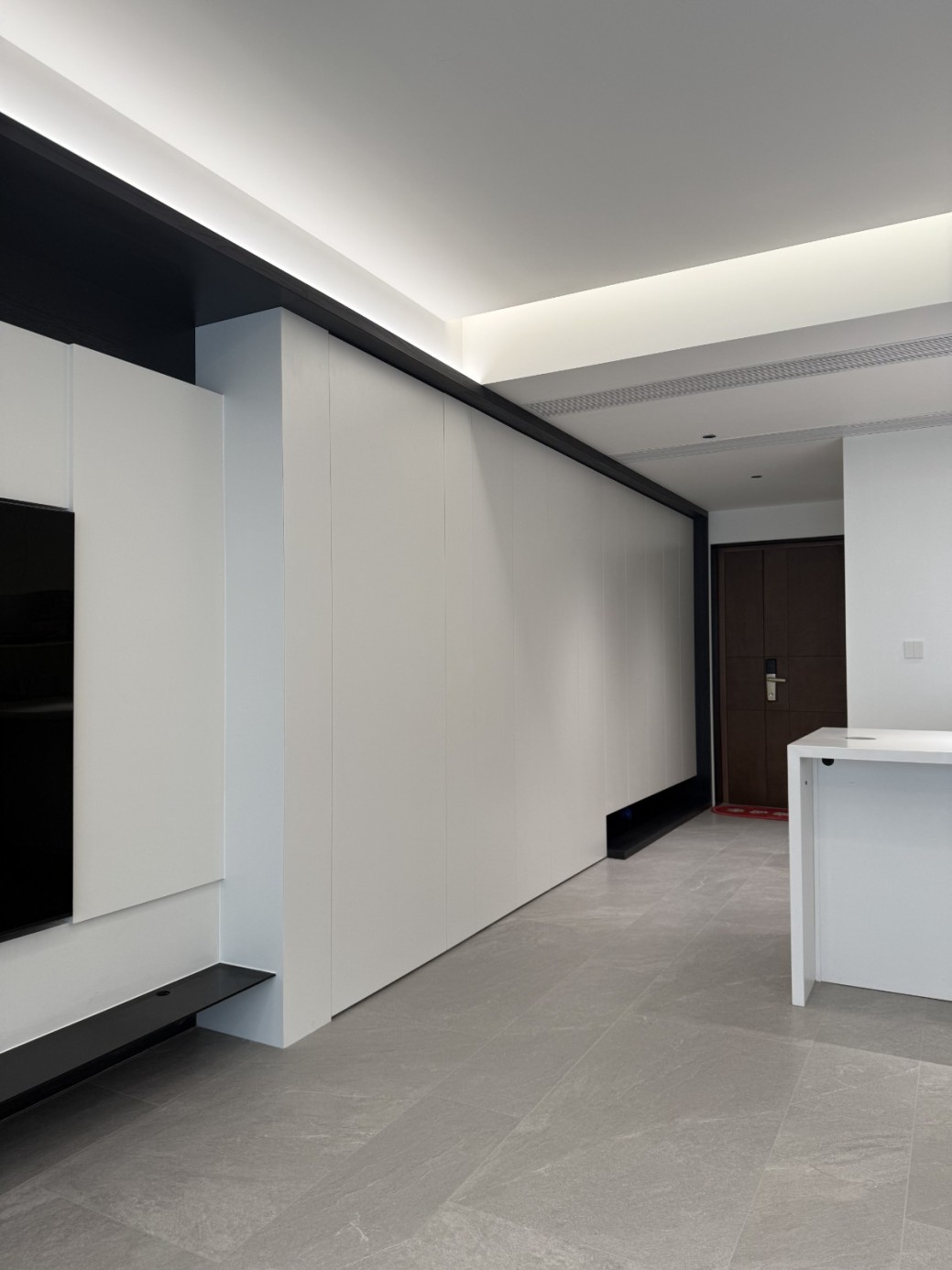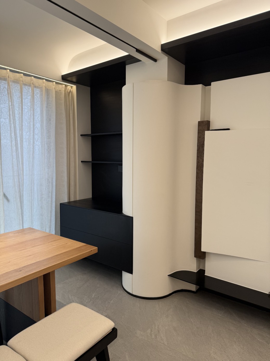 现代极简工业风的全屋定制设计,以白、灰、黑为主色调,通过无拉手的简洁柜体、利落的直线条和悬浮式安装,营造出干净通透的空间氛围。大面积纯色墙面与哑光灰色柜体形成层次对比,搭配线性灯光与玻璃隔断,弱化了柜体的厚重感,既满足了实用收纳与操作功能,又凸显出冷静克制的高级质感,完美契合现代办公或轻奢住宅对简约、利落、功能性的设计追求。
