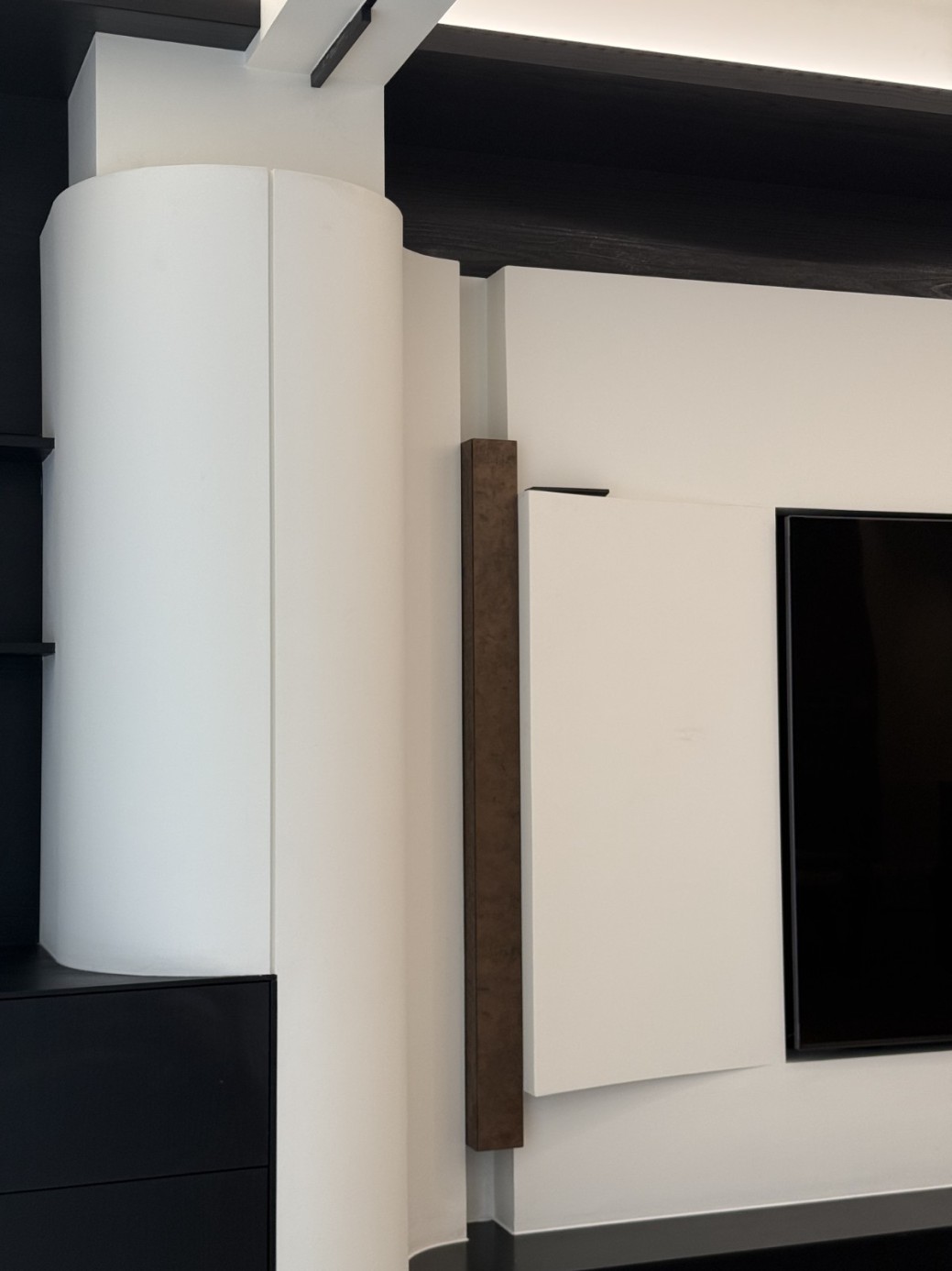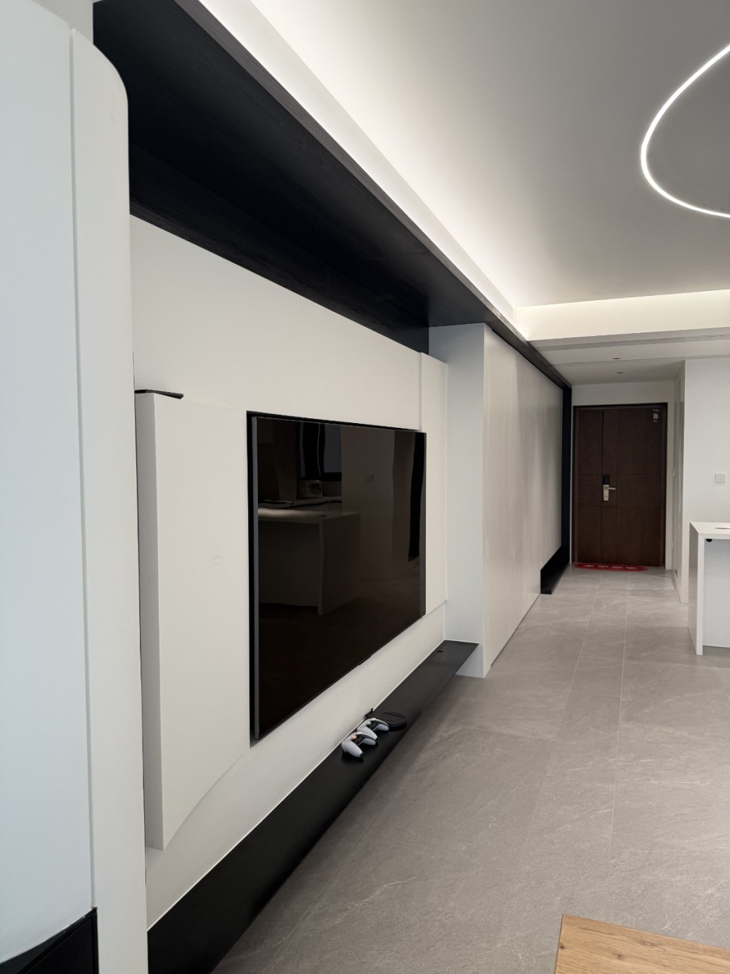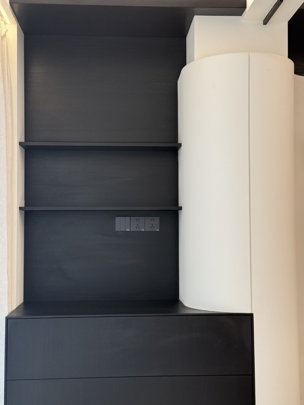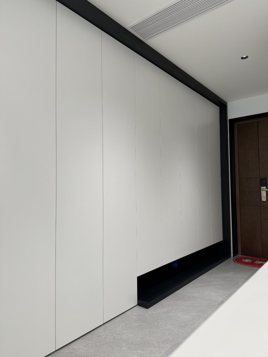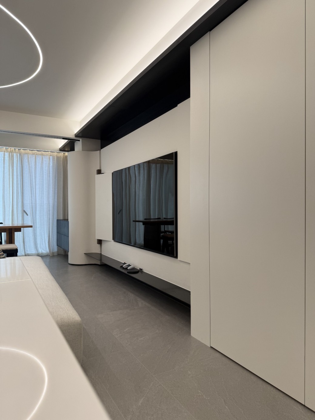 现代极简工业风的全屋定制设计,以白、灰、黑为主色调,通过无拉手的简洁柜体、利落的直线条和悬浮式安装,营造出干净通透的空间氛围。大面积纯色墙面与哑光灰色柜体形成层次对比,搭配线性灯光与玻璃隔断,弱化了柜体的厚重感,既满足了实用收纳与操作功能,又凸显出冷静克制的高级质感,完美契合现代办公或轻奢住宅对简约、利落、功能性的设计追求。