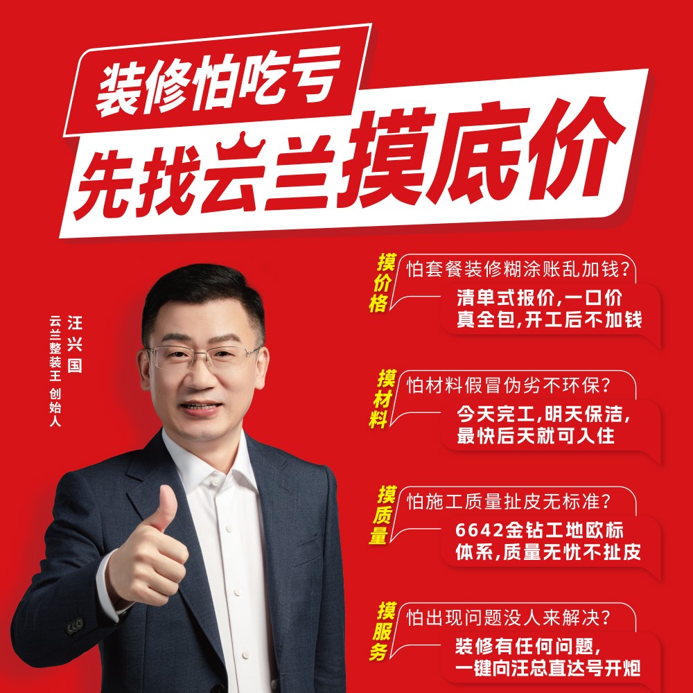 装修怕吃亏,先找云兰摸底价!找云兰,摸价格:怕套餐装修糊涂账乱加钱?云兰整装王清单式整装价格大全上墙公示,开工后不增项不加钱;找云兰,摸质量:怕施工质量扯皮无标准?云兰整装王6642金钻工地欧标体系,质量无忧不扯皮;找云兰,摸材料:怕材料假冒伪劣不环保?今天完工,明天保洁,最快后台就可入住,超2万平实景展厅5000多种材料亮证保真,真环保才健康;找云兰,摸服务:怕出现问题没人来解决?装修有问题,一键向汪总直达号开炮。
