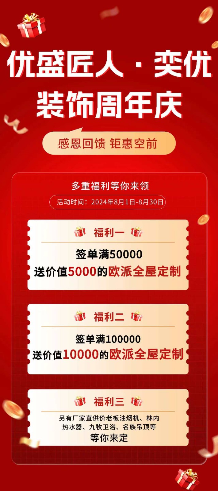 优盛匠人周年庆活动: 签单满50000赠送价值5000元的欧派全屋定制 签单满100000赠送价值10000的欧派全屋定制 另有厂家直供老板油烟机、林内热水器、TT卫浴、名族吊顶等